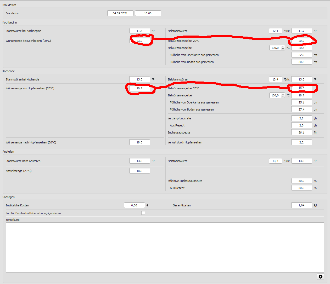 Im Spickzettel steht halt unabhängig von der Gabe späterer Zutaten das gleiche Volumen Würze vor dem Hopfenseihen und die gleiche "nicht hilfreiche" Ziel-Stammwürze beim Anstellen.