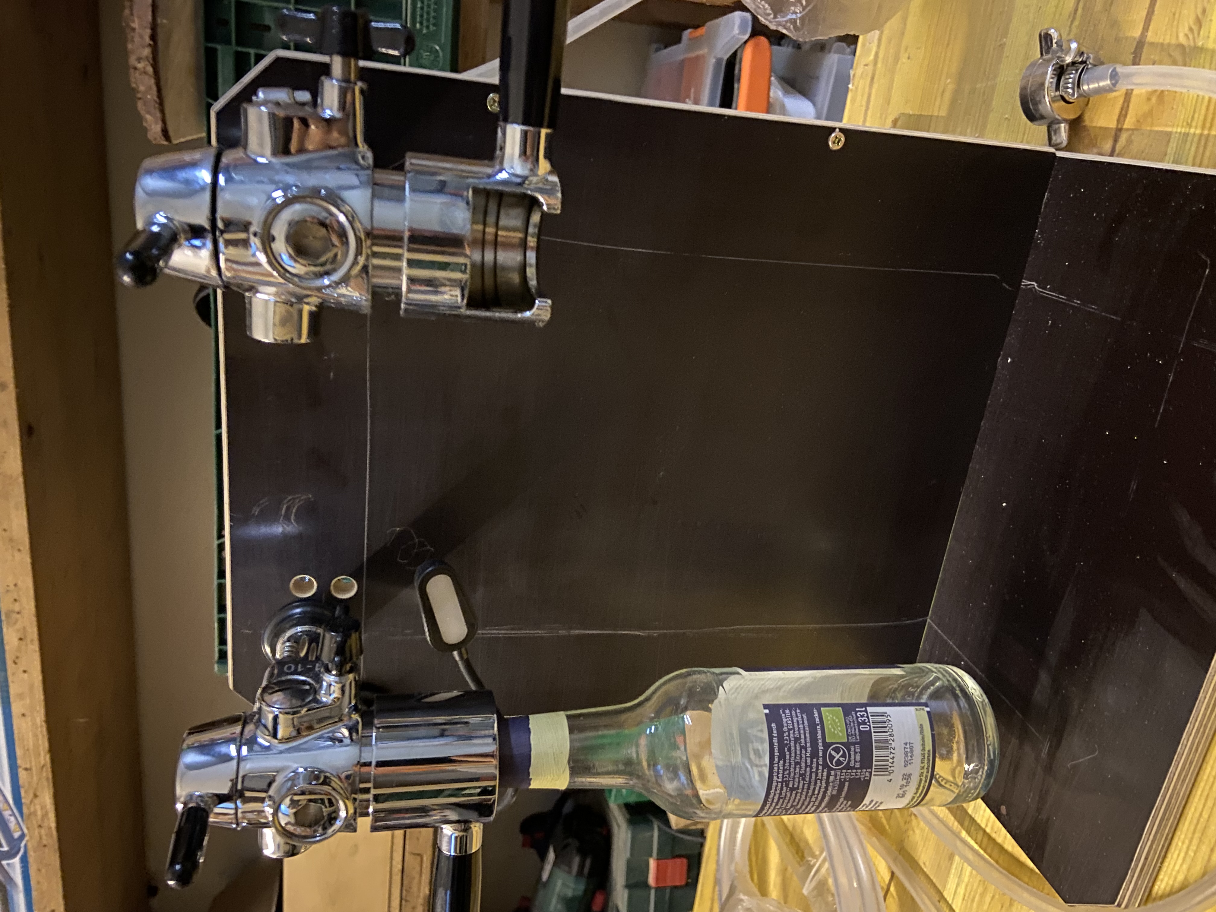 Ich hab mir auch vor einiger Zeit so ein Teil gegönnt. Direkt von Aliexpress für ca. 60 Euro (ist aber die Version, die nur PET kann, da ich eigentlich nur noch in PET-Flaschen abfülle), versandkostenfrei. Montiert an einer Schanksäule auf einem Tisch vom bekannten schwedischen Brauausstatter. An der Rückseite habe ich noch einen CO2-Verteiler angebracht, so dass ich am Fass und am Abfüller stets den gleichen Druck anliegen habe. Ich habe damit jetzt auch ca. 100 Liter abgefüllt und bin super zufrieden. Geht schnell, weitestgehend schaumfrei (nachdem die Apparatur auf die Biertemperatur heruntergekühlt ist) und mit Oxidation habe ich noch überhaupt keine Probleme gehabt. Zerlegen tue ich das Teil für die Reinigung nicht. Einfach Reinigungskeg dran, ordentlich mit Chemipro-San Lösung spülen, mit Leitungswasser nachspülen, mit CO2 trockenblasen und fertig. @uli74: Vielen Dank für den Link zum Glasflaschenadapter! Den kannte ich noch nicht und habe ihn mir gleich bestellt. Ich fülle zwar nicht in Glas ab, habe aber 330 ml PET-Flaschen mit Kronenkorkenmündung, die für die Halterung zu schmal sind. Momentan klemme ich die mit zwei Kaminhölzern fest, der Adapter ist aber mit Sicherheit einfacher in der Handhabung :). Hier noch ein paar Bilder von meinem Setup: