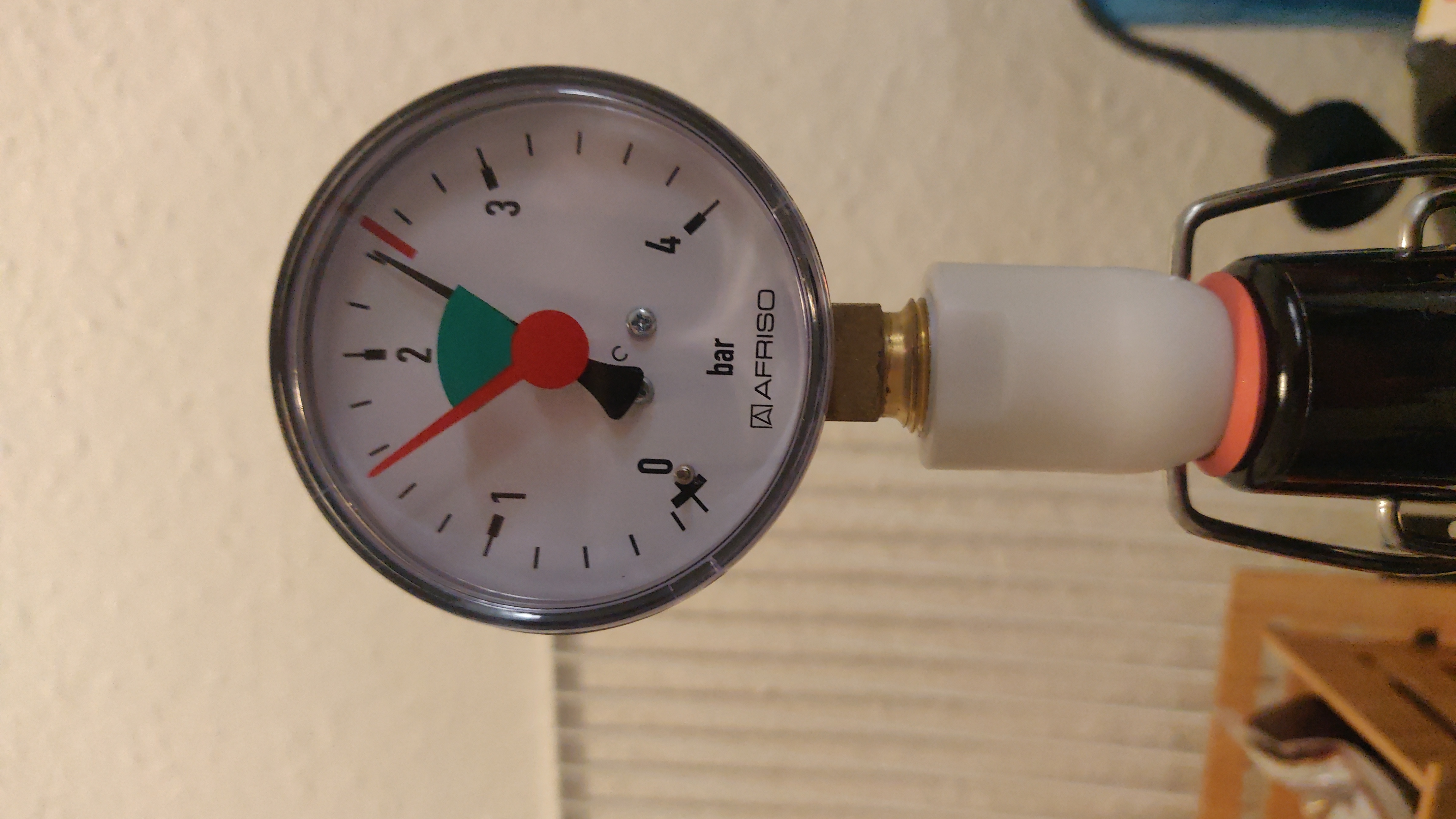 Die Manometerflasche zeigt mittlerweile einen Druck von knapp 2.5 Bar und die NG kommt langsam zum Erliegen. (5.5g CO₂/l waren geplant)