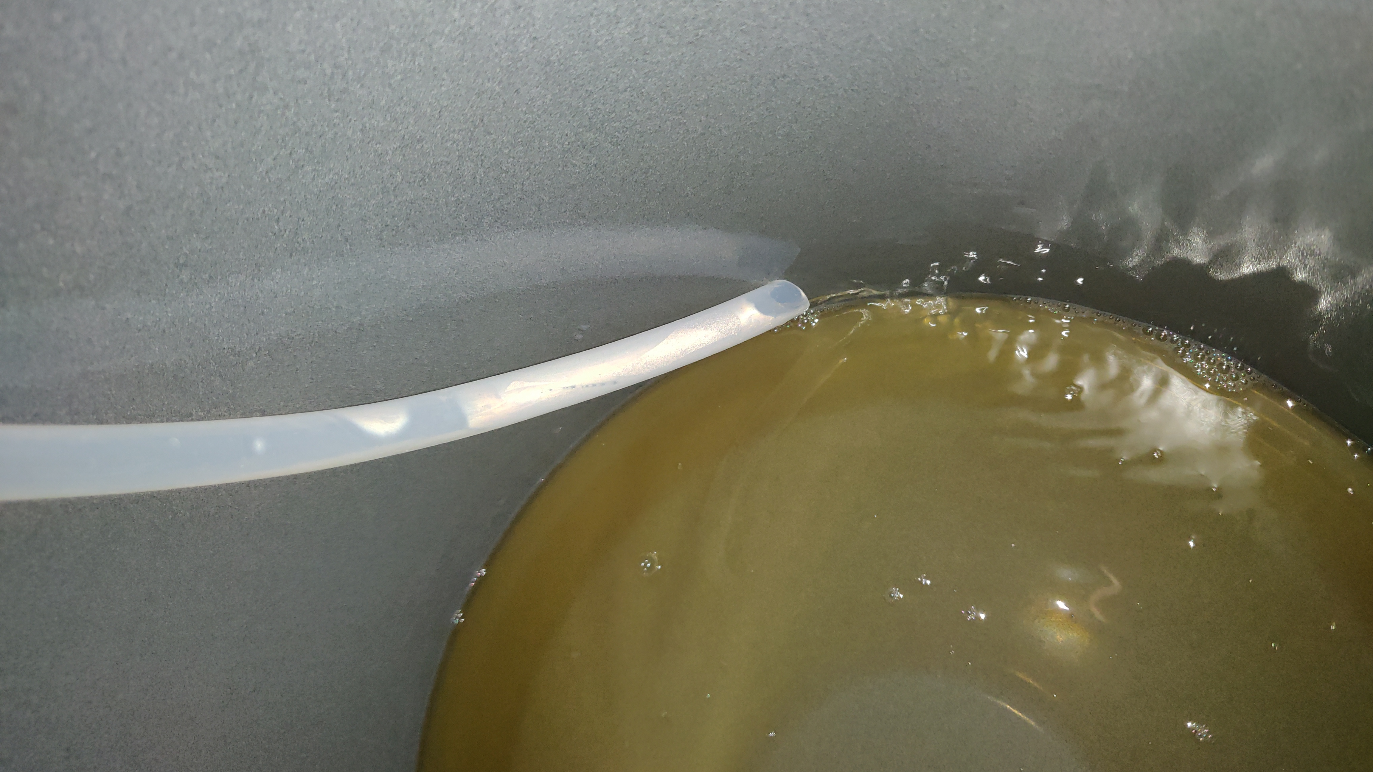 Nach 20 Minuten Ruhe, in der ich die Hefe rehydriert habe, dann die Würze runtergekühlt und durch einen frisch abgekochten Monofilamentfilter in das Gärfass.