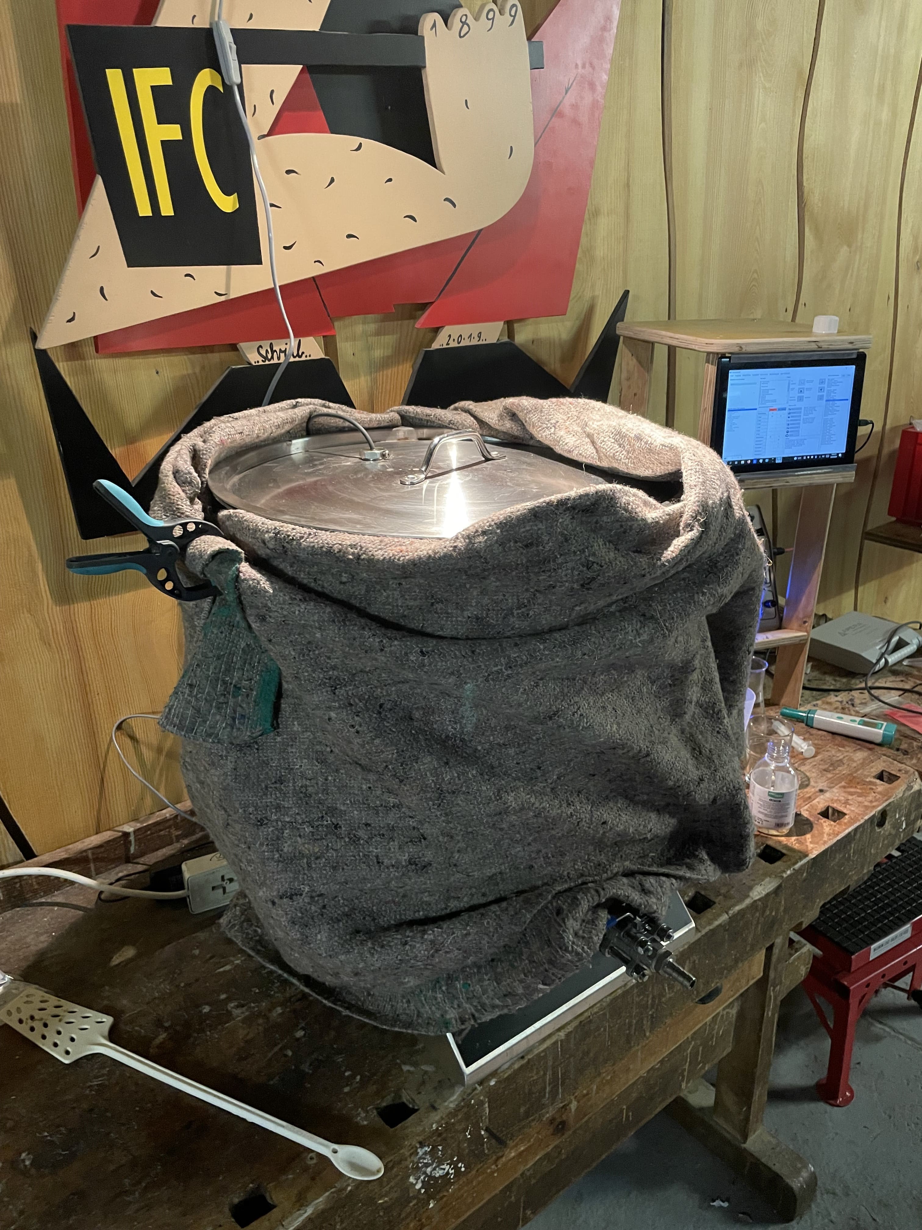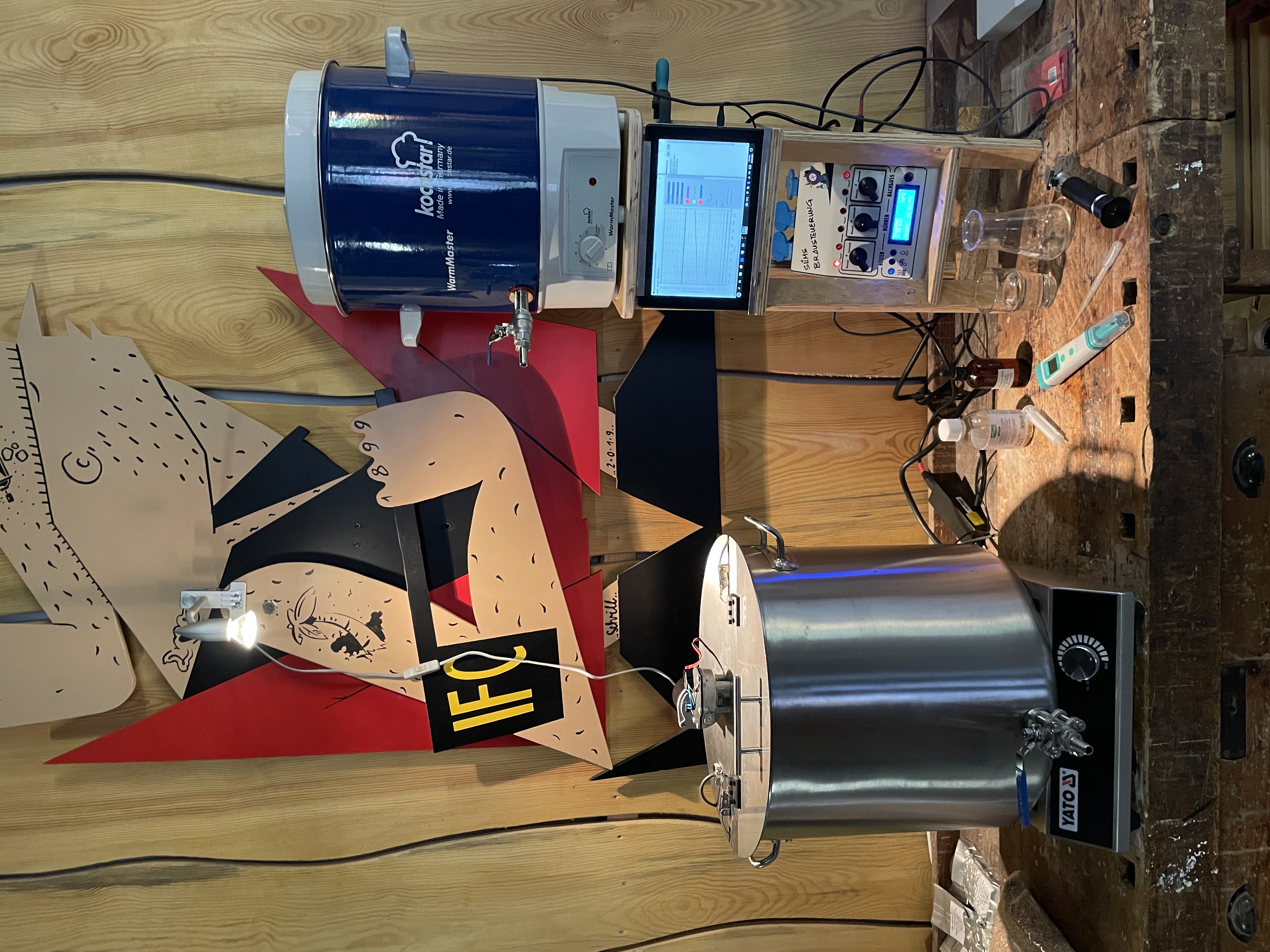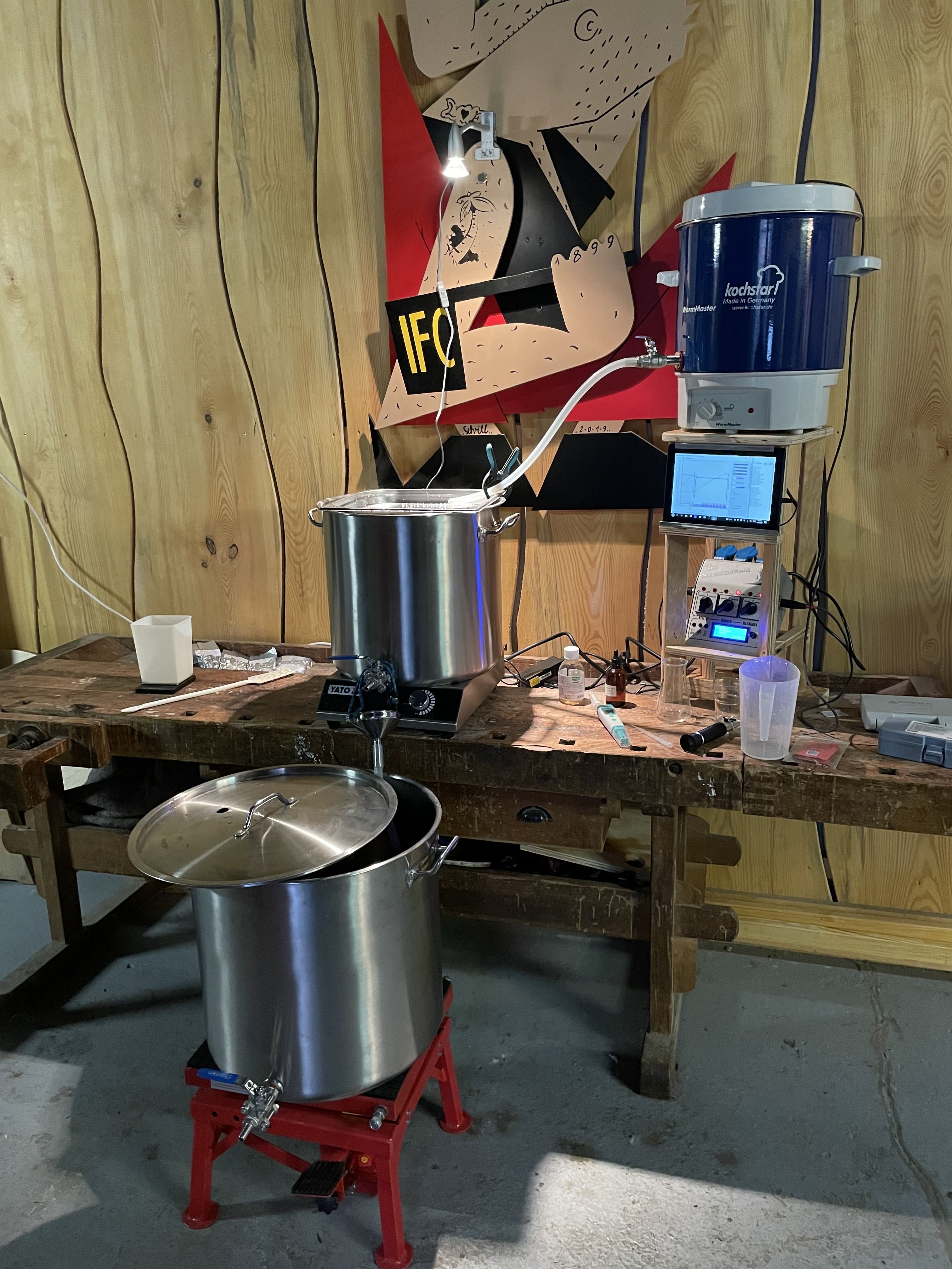 Ich habe leider keinen festen Brauplatz und bauen meine kleine mobile Anlage jedes Mal an einer Werkbank in unserem Vereinshaus auf. Maischpfanne, Brausteuerung, Nachgusseinwegtopf und einiges an Utensilien wurden bereit gestellt.