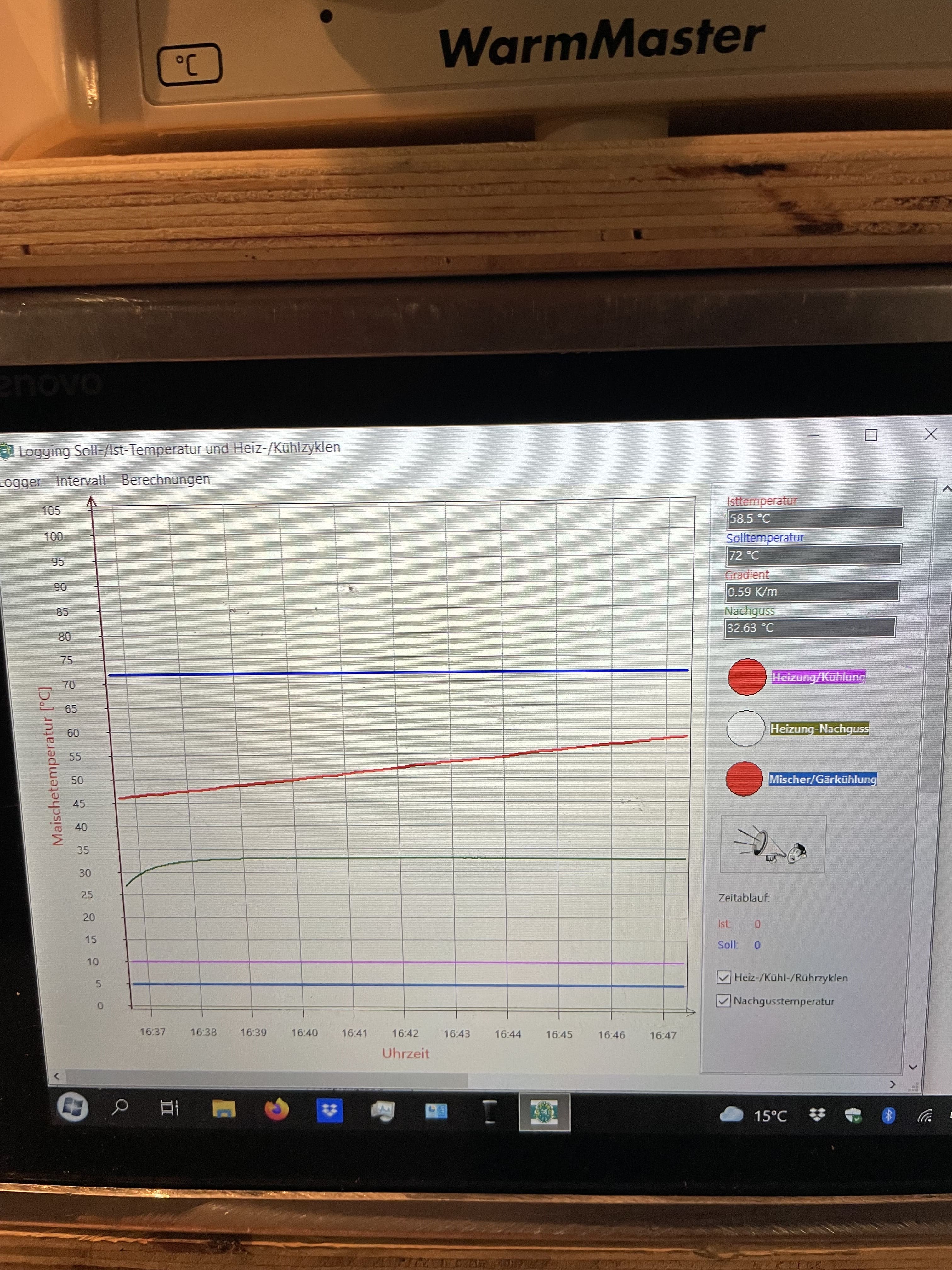 Und das logging der Brausteuerung geobachtet. Der Gradient schwankte zwischen 1,2 und 0,7 Grad pro Minute, was total ok für mich war.