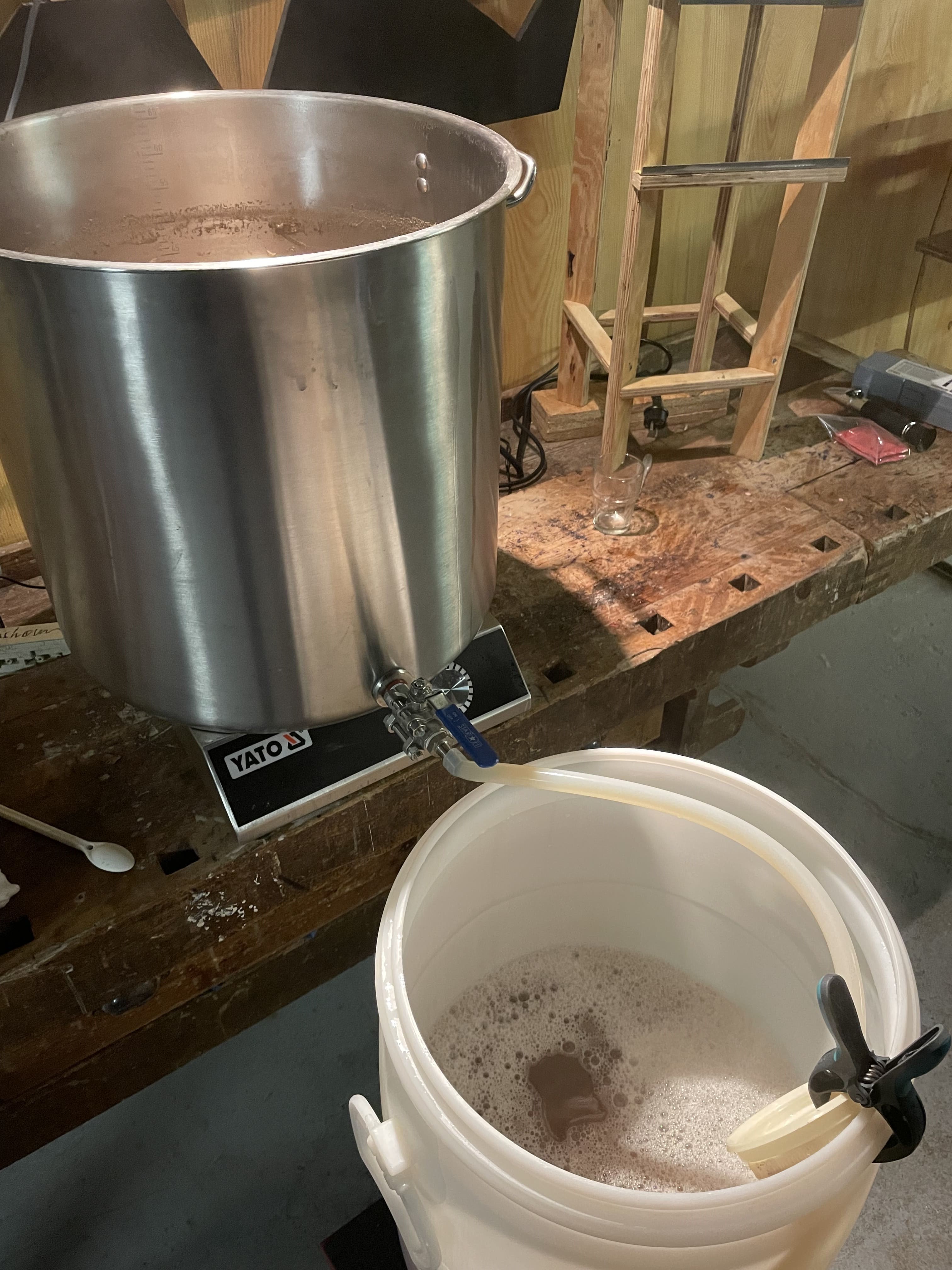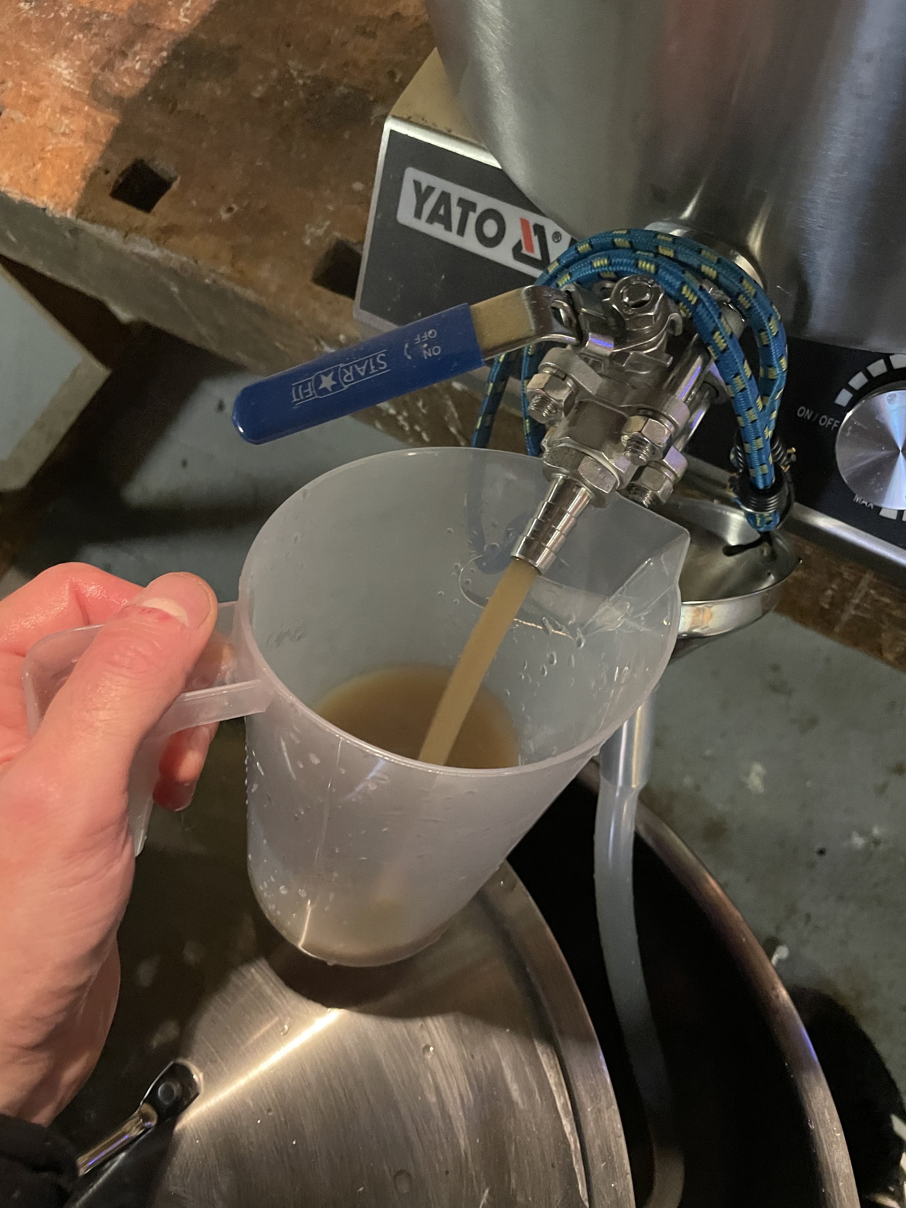 Nach dem Läutern hebe ich die volle Pfanne mit einer Motoradhebebühne wieder auf das Niveau der Yato Platte und habe so leichtes Spiel die volle Pfanne wieder auf die Platte zu bekommen. Ich habe auch schonmal vor dem Läutern die Yato Platte auf die Hebebühne gestellt und dann die Sudpfanne darauf plaziert, wodurch ich beim Läutern schon mit dem hochheizen beginnen konnte. Das hat einiges an Zeit eingespart, war aber auch nervig weil ich zuvor die volle Maischepfanne von der Platte heben musste. Eine zweite Yato Platte wäre hier wohl das Beste.