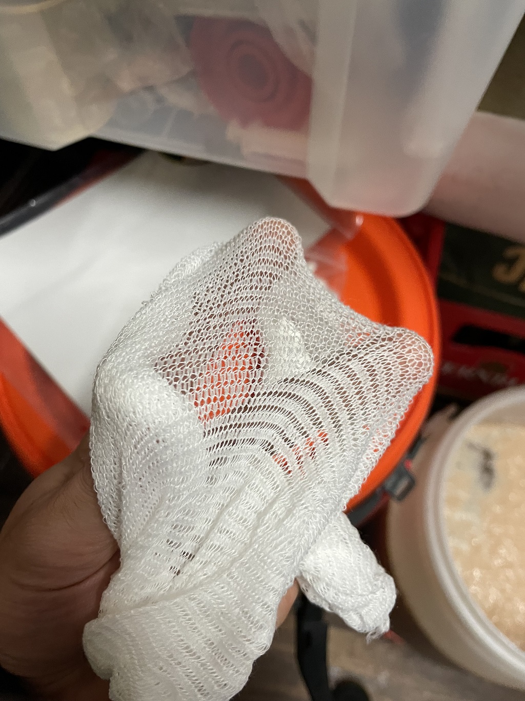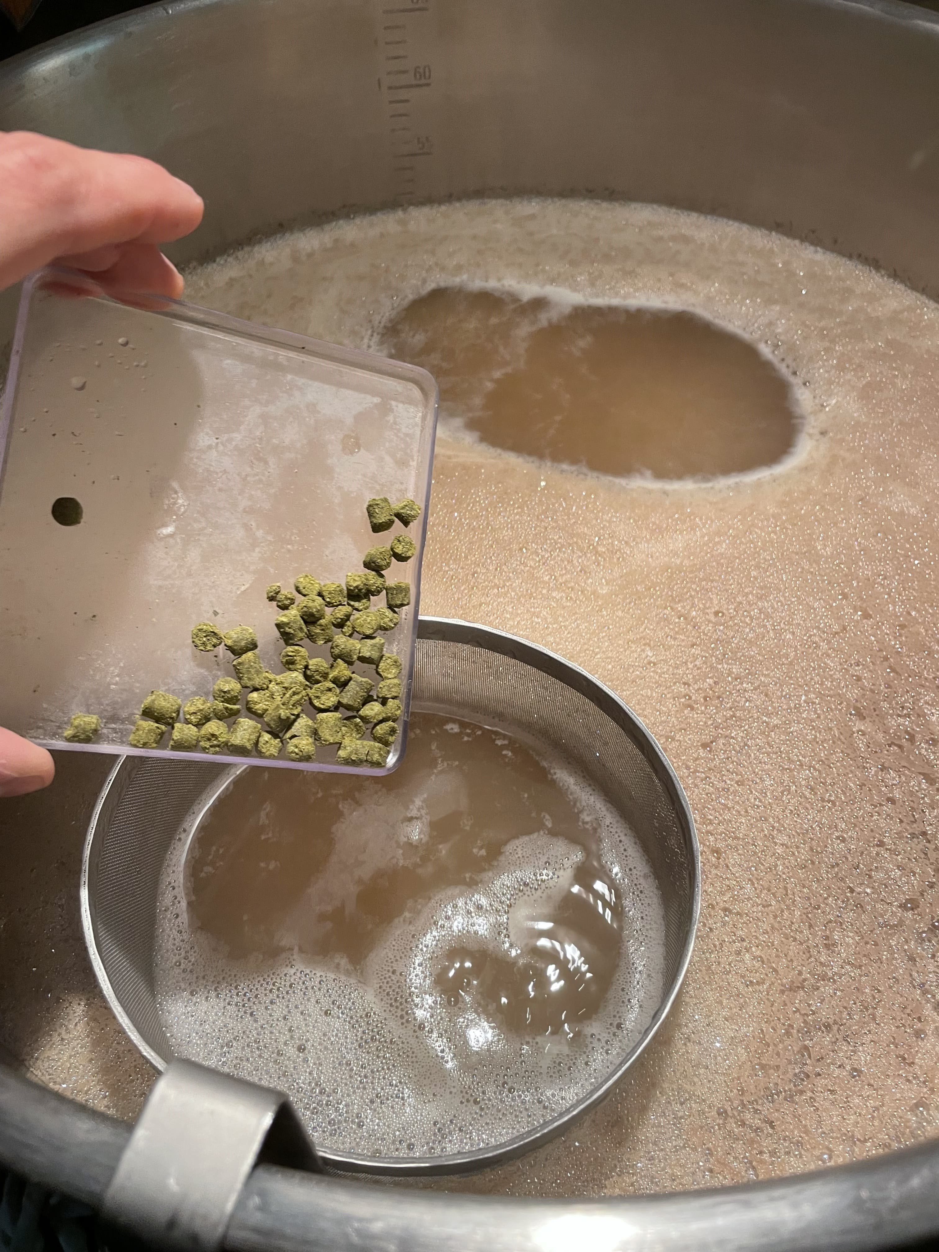 Nach dem Kochen waren es dann nur noch 45 Liter. Somit habe ich 5 Liter beim Kochen verdampft. Beim Sud davor waren es nur 4 Liter. Wie auch immer, das Hopfenseihen stand an.