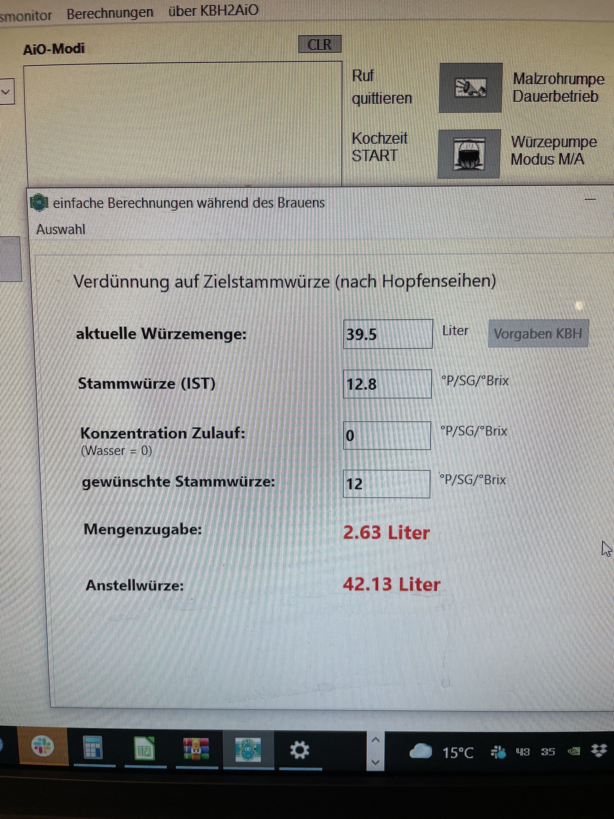 Braurechner sagt ich soll 2,6 Liter hinzugeben um auf meine gewünschte Stammwürze zu kommen. Nachdem ich dann auch mal gecheckt habe, dass ich 12° Plato statt 12,3° Plato in den rechner getippt habe, habe ich dann doch mit 3 Liter verdünnt.