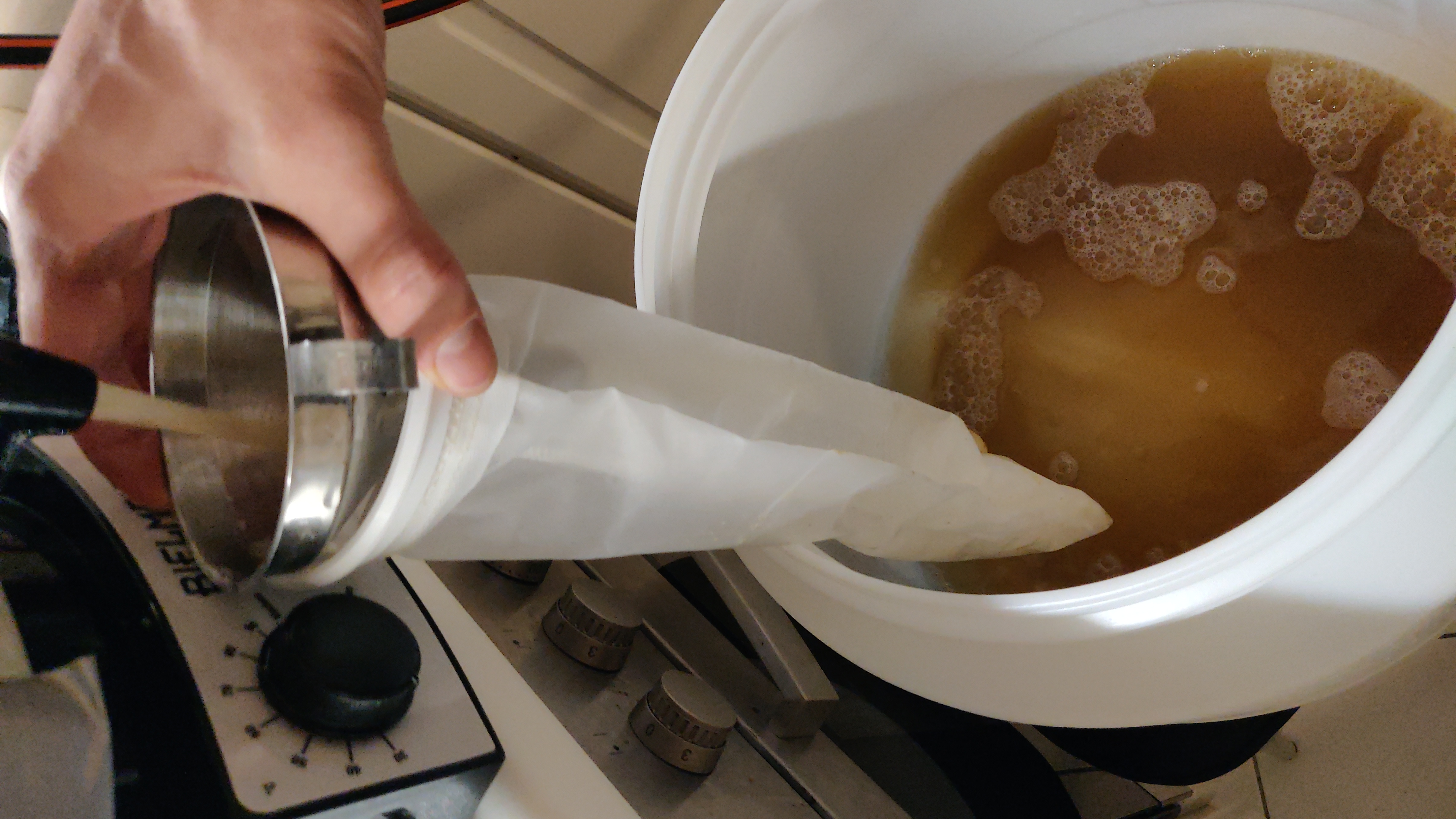 Nach 20 Minuten Ruhe, in der ich die Hefe rehydriert habe, dann die Würze runtergekühlt und durch einen frisch abgekochten Monofilamentfilter in das Gärfass.