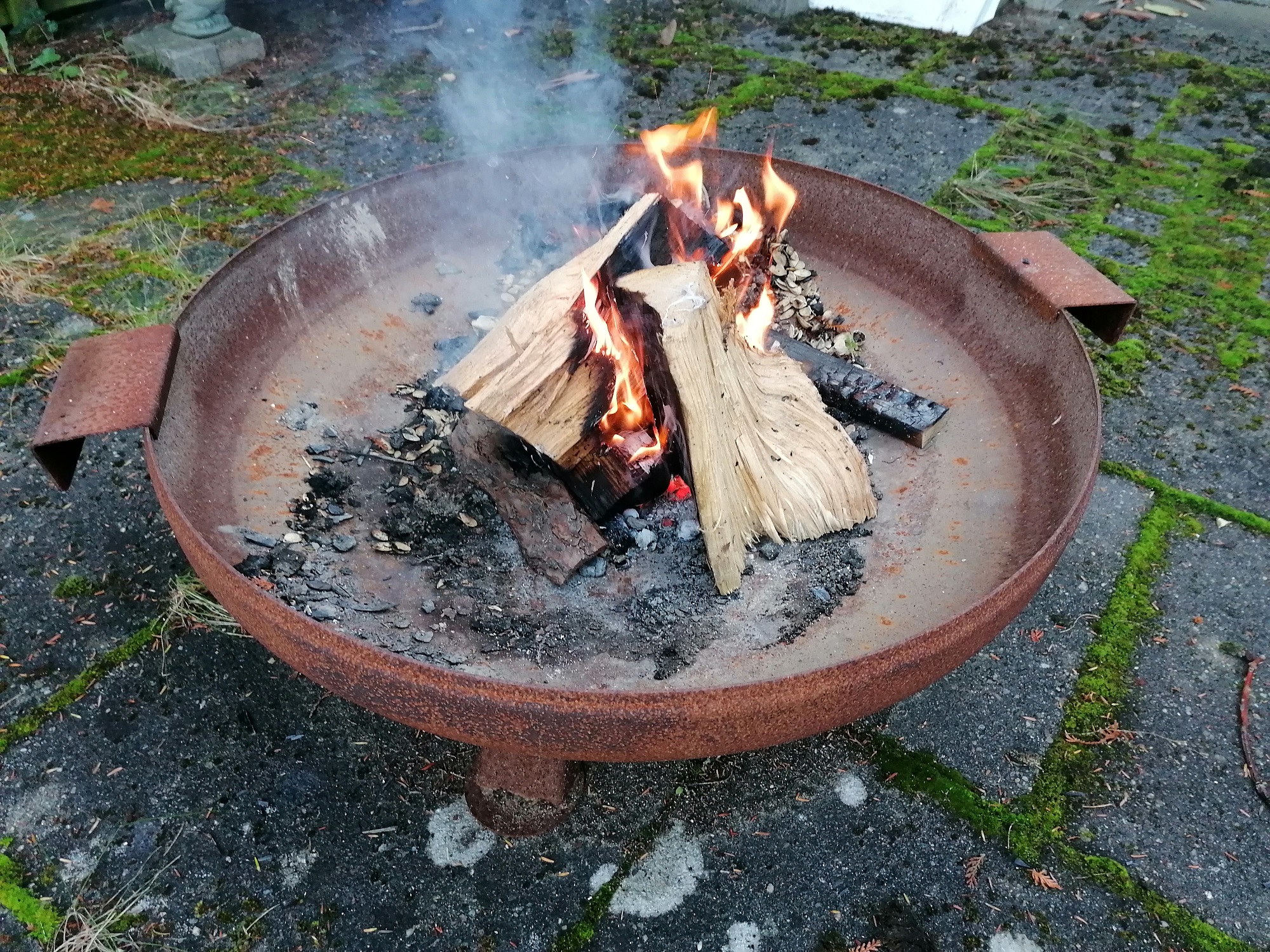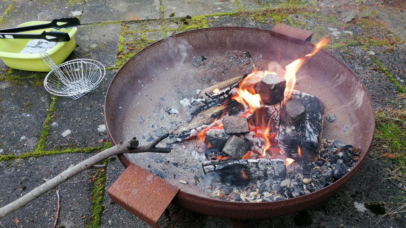 Zuerst wurde das Feuer entzündet. In der Zwischenzeit wurden schon mal die Platten und Töpfe aufgebaut. Der Granit wurde vorbereitet und in Position gebracht. Um die Steine in die Töpfe zu geben, hatte ich extra für das Experimentierstadium ein von diesen Hänge-Obstkörben