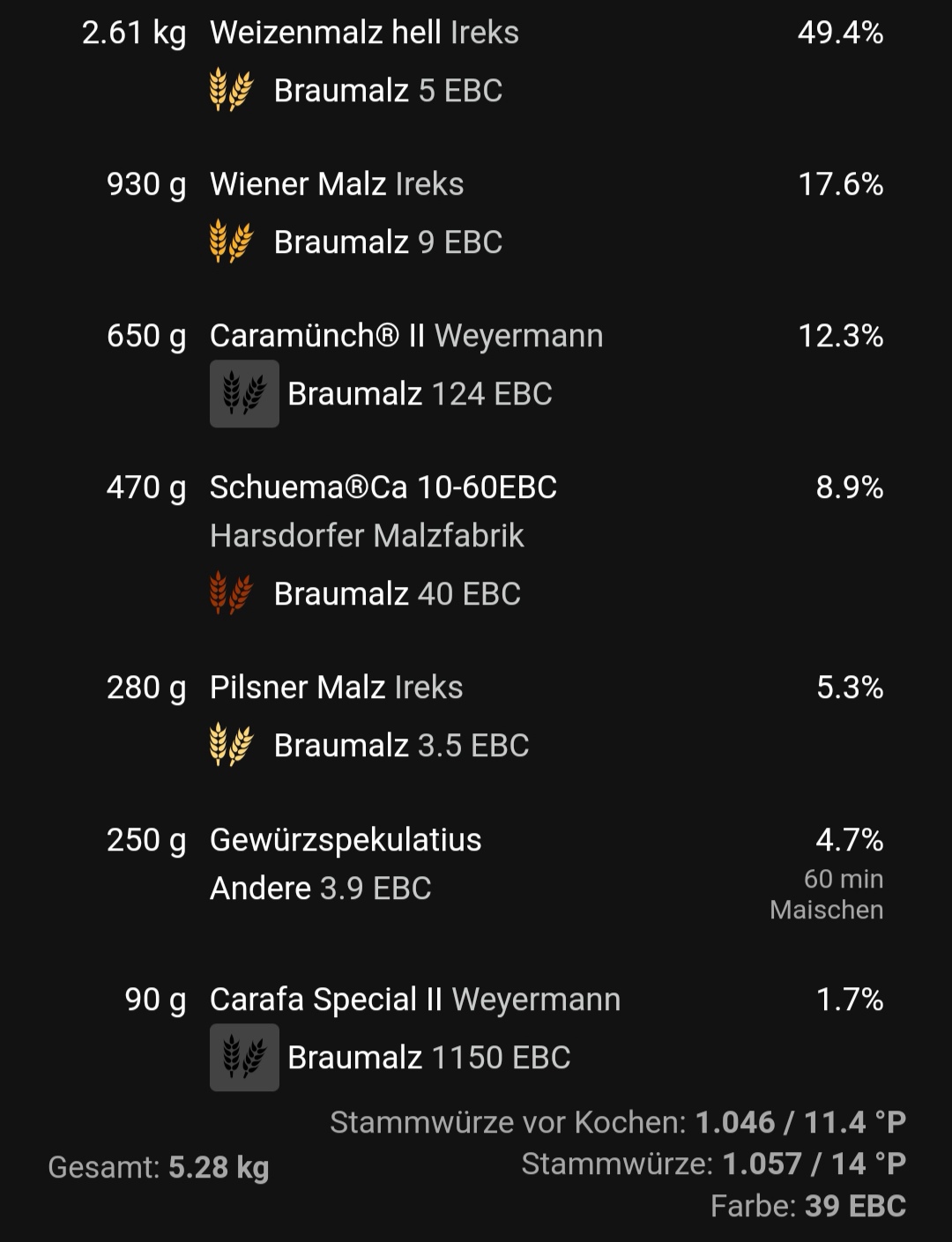 Eigentlich wollte ich nur ein kräftigeres dunkles Weizen brauen. Dann kam mir die Idee mal den Spekulatius mit zu verarbeiten. Und nach 1000 Änderungen an den Zutaten sieht es dann so aus. Ich habe nicht so das richtige Basisrezept gefunden was dann mit meinen Zutaten zusammenpasst.