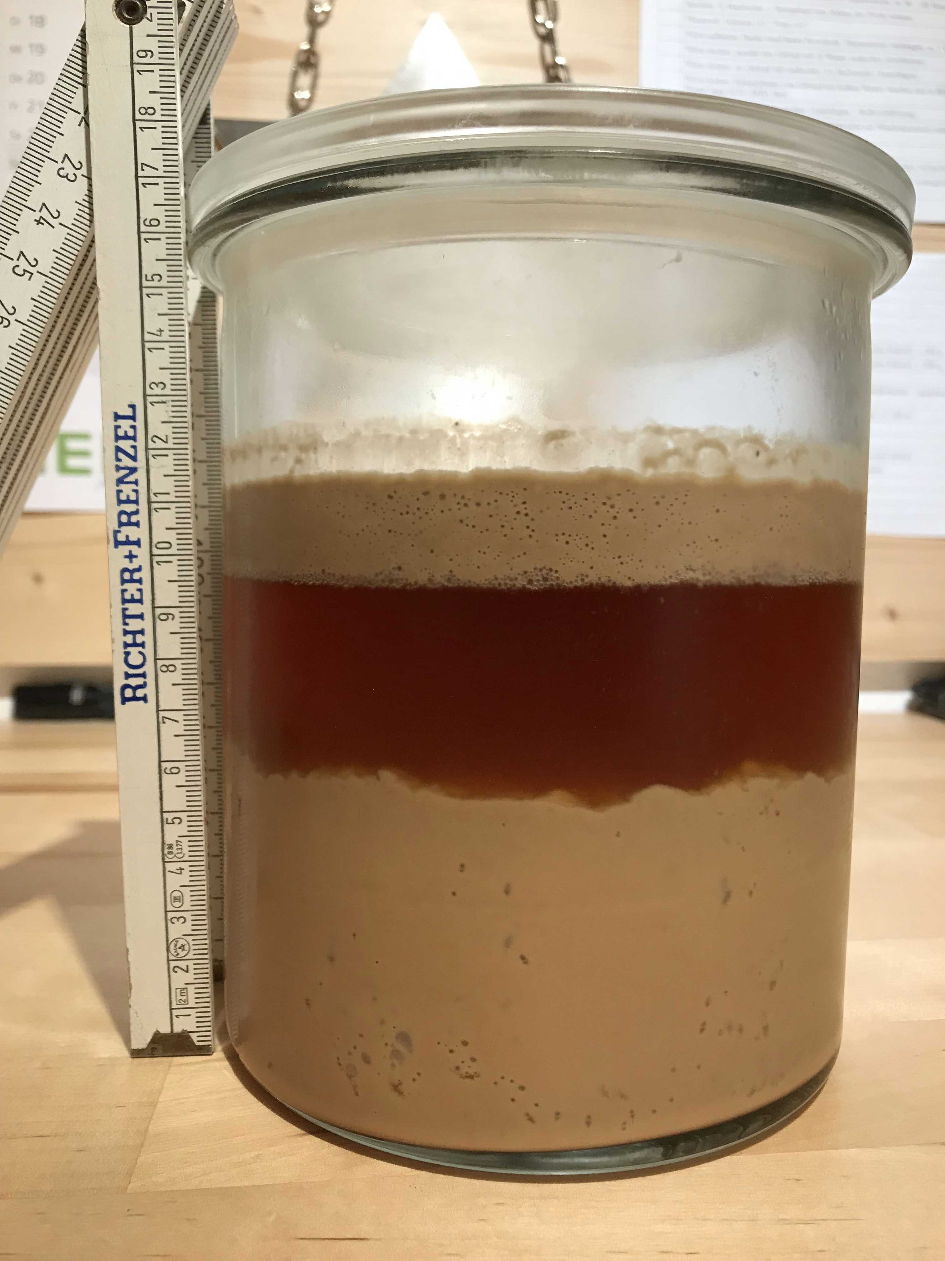 Der Überstand wird weggekippt, vom Bodensatz wird das notwendige Hefe Volumen