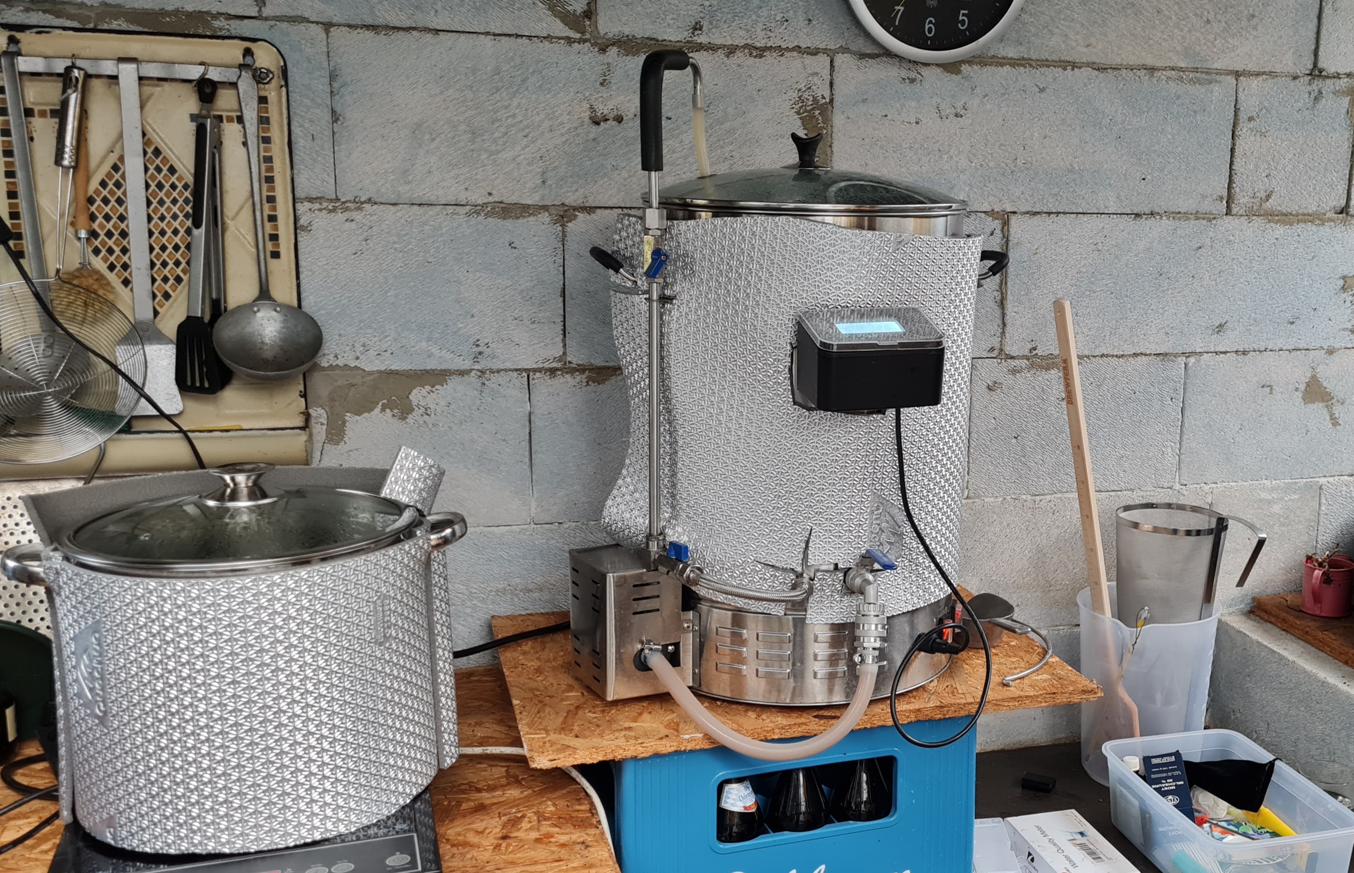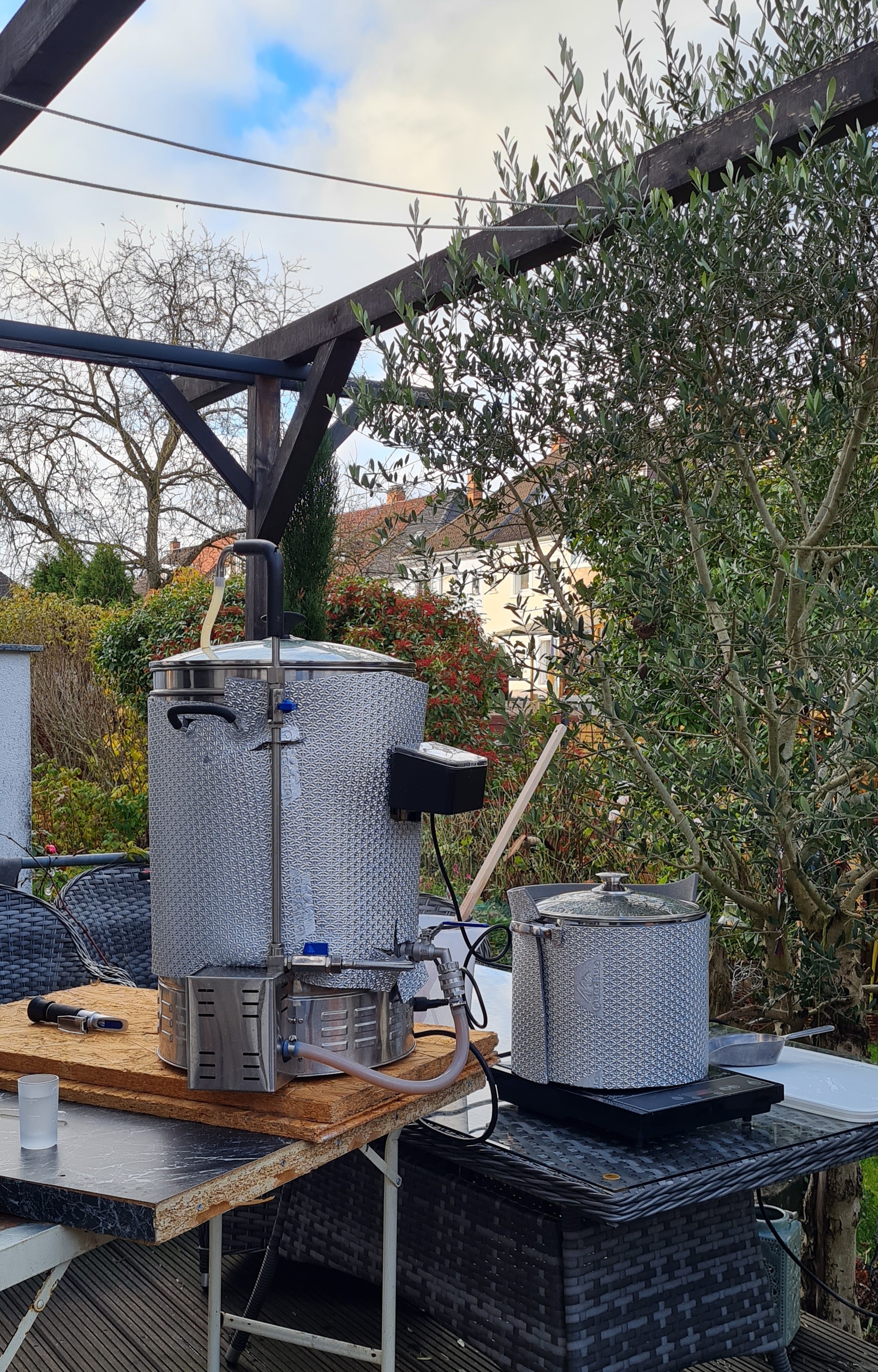2 Töpfe (50 und 70l) 1x GSM IDS2 fürs maischen ( hoffentlich bald mit Brautomat32) und eine MetroPlatte mit großem Heizfeld für den 70l Topf