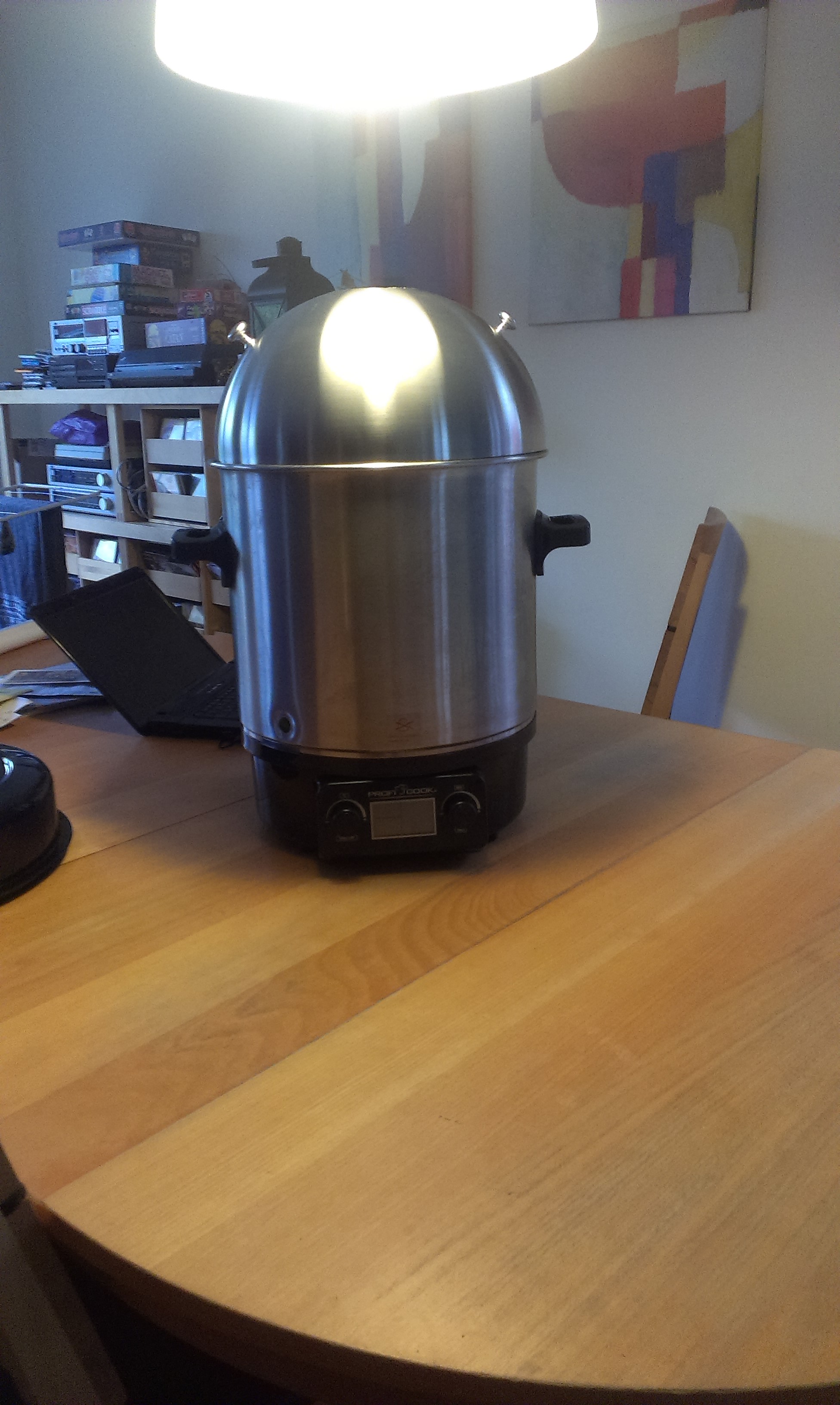 Deckel geht beim Kochen nicht weil es übergeht. Die Brüdenhaube hilft da auch nicht so ganz, aber man kann einen Schlauch nach draussen drauf setzen, oder einen Dampfkondensator (Bild) anschließen. Ziel ist es 10% der Würze zu verdampfen ohne Sauna im Raum. Das schmeckt man dann. 5l Wasser die an den Wänden runter rinnen sind doch etwas viel, wenn man in kleinen Räumen arbeitet.