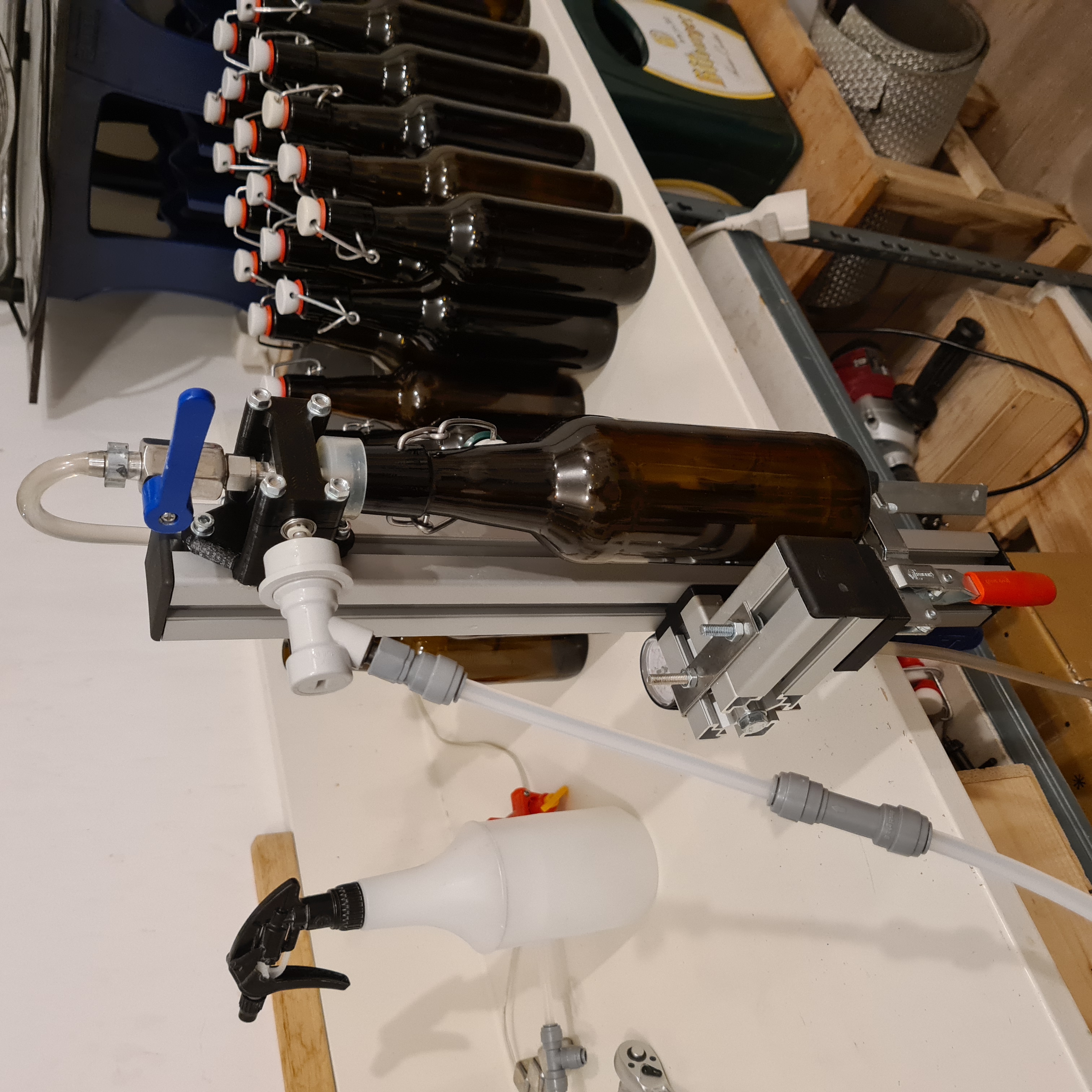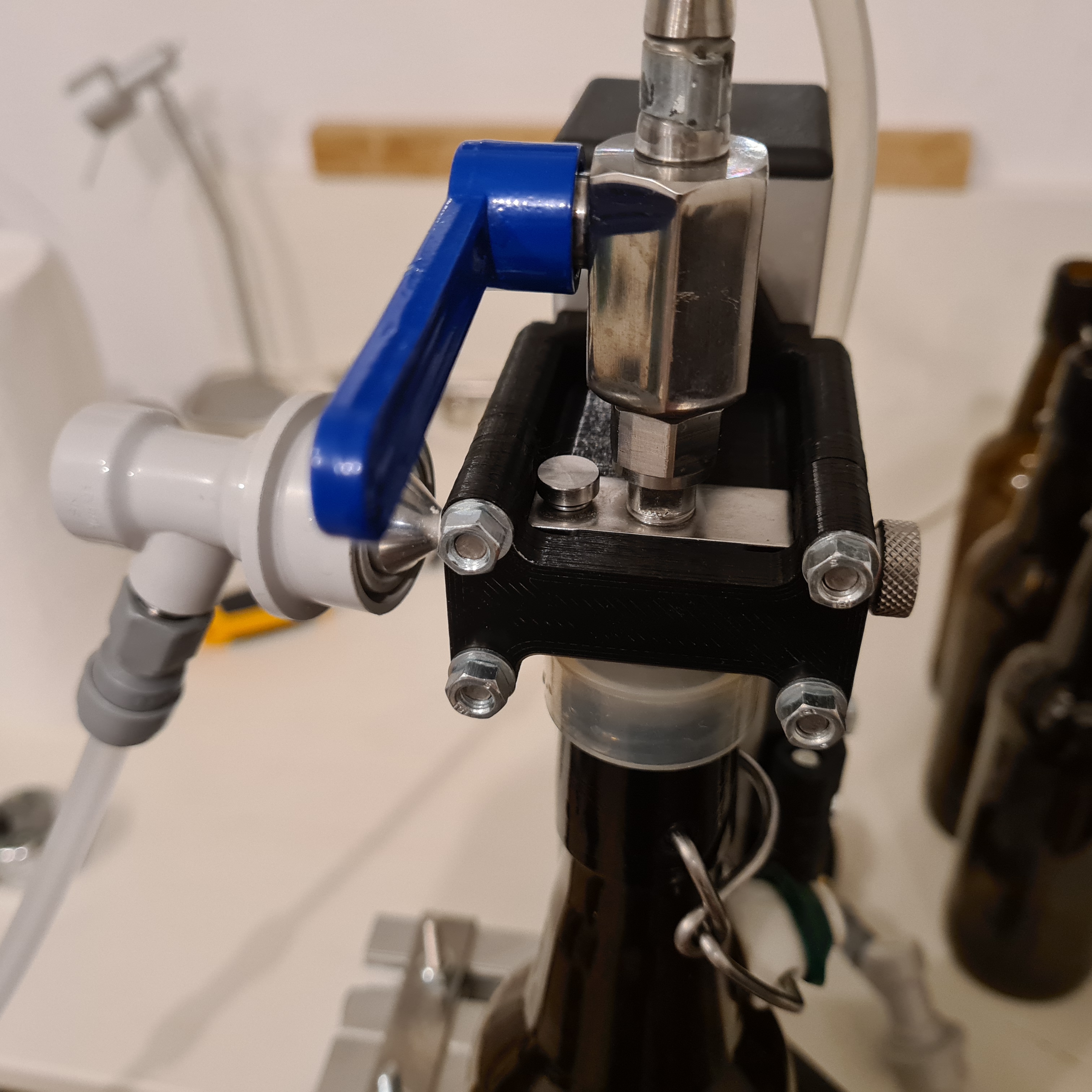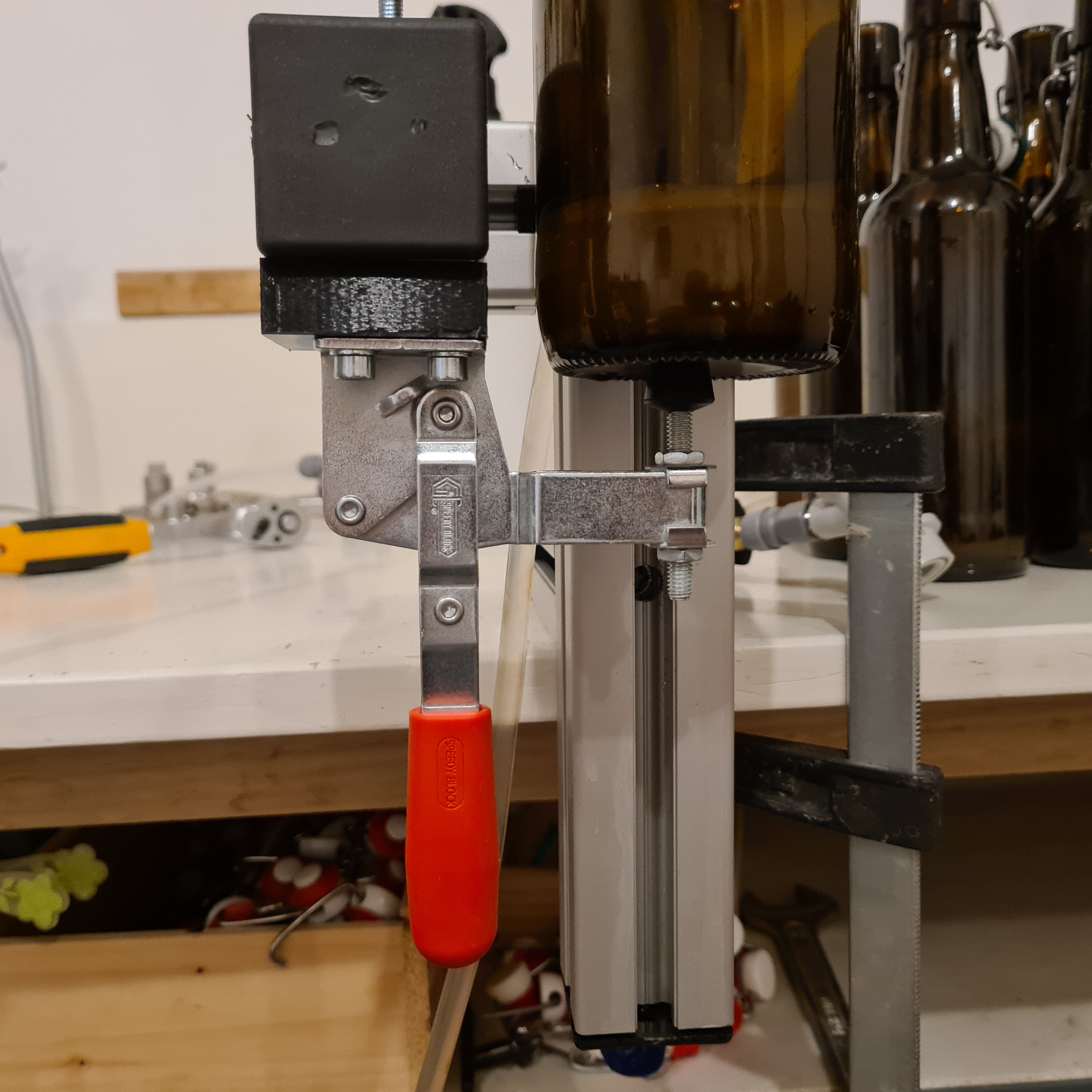 Heraus kam ein Ständer für den Tapcooler für die einfache Entnahme des TC und mit einem richtig guten Spannhebel für die Flaschen.