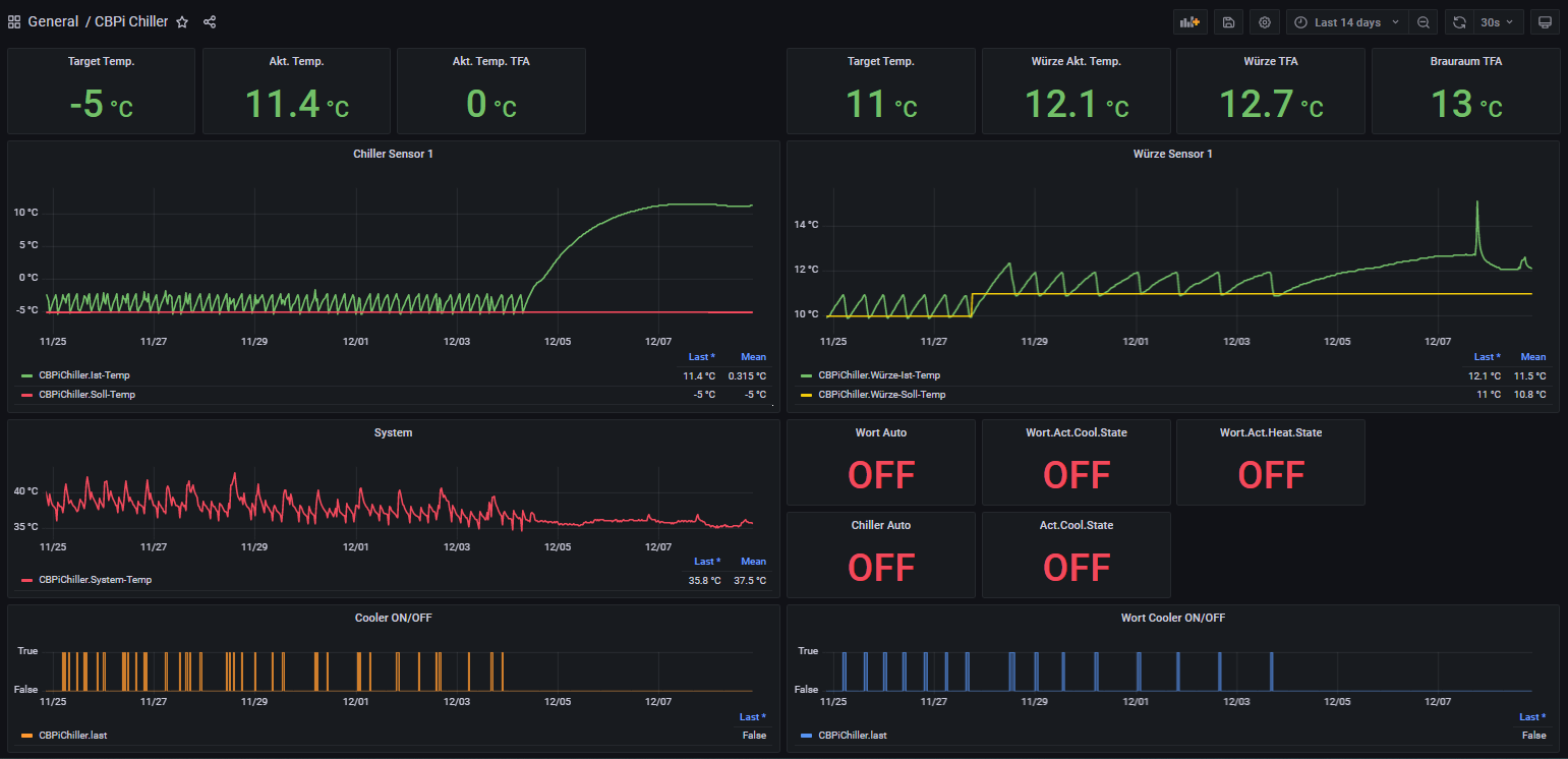 Bei mir läuft folgendes Szenario mit den Standard-Konfigurationen ohne tiefergehende Softwareanpassungen der einzelnen beteiligten Systeme, um Temperatur-Daten in grafana aus CBPI aufzubereiten: