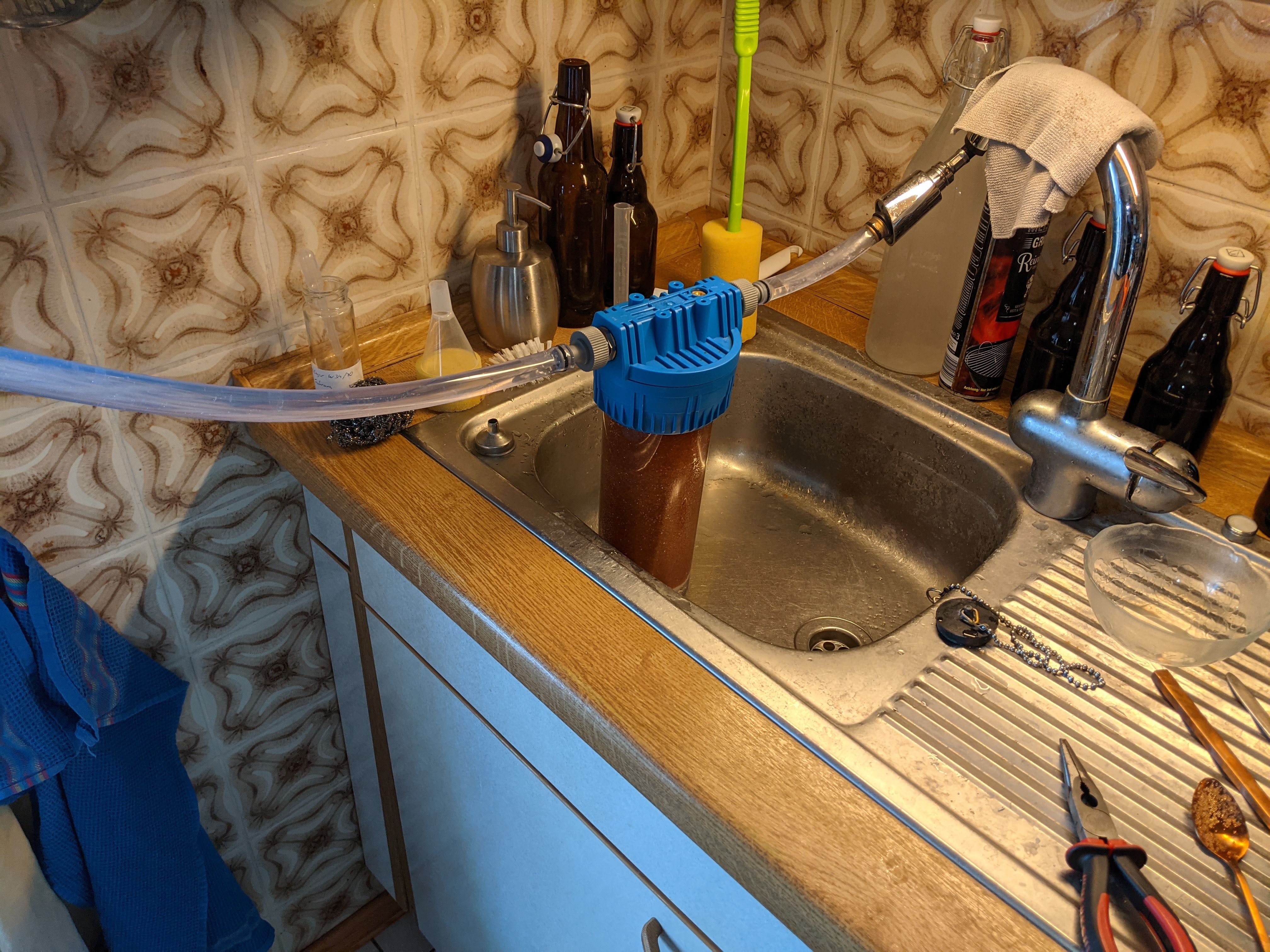 Und hier ist es passiert: Meine erste Läuterkatastrophe. Aber gut, passiert. Treber nochmal aufgewirbelt, 20 Minuten gewartet und dann lief die Würze locker flockig durch.