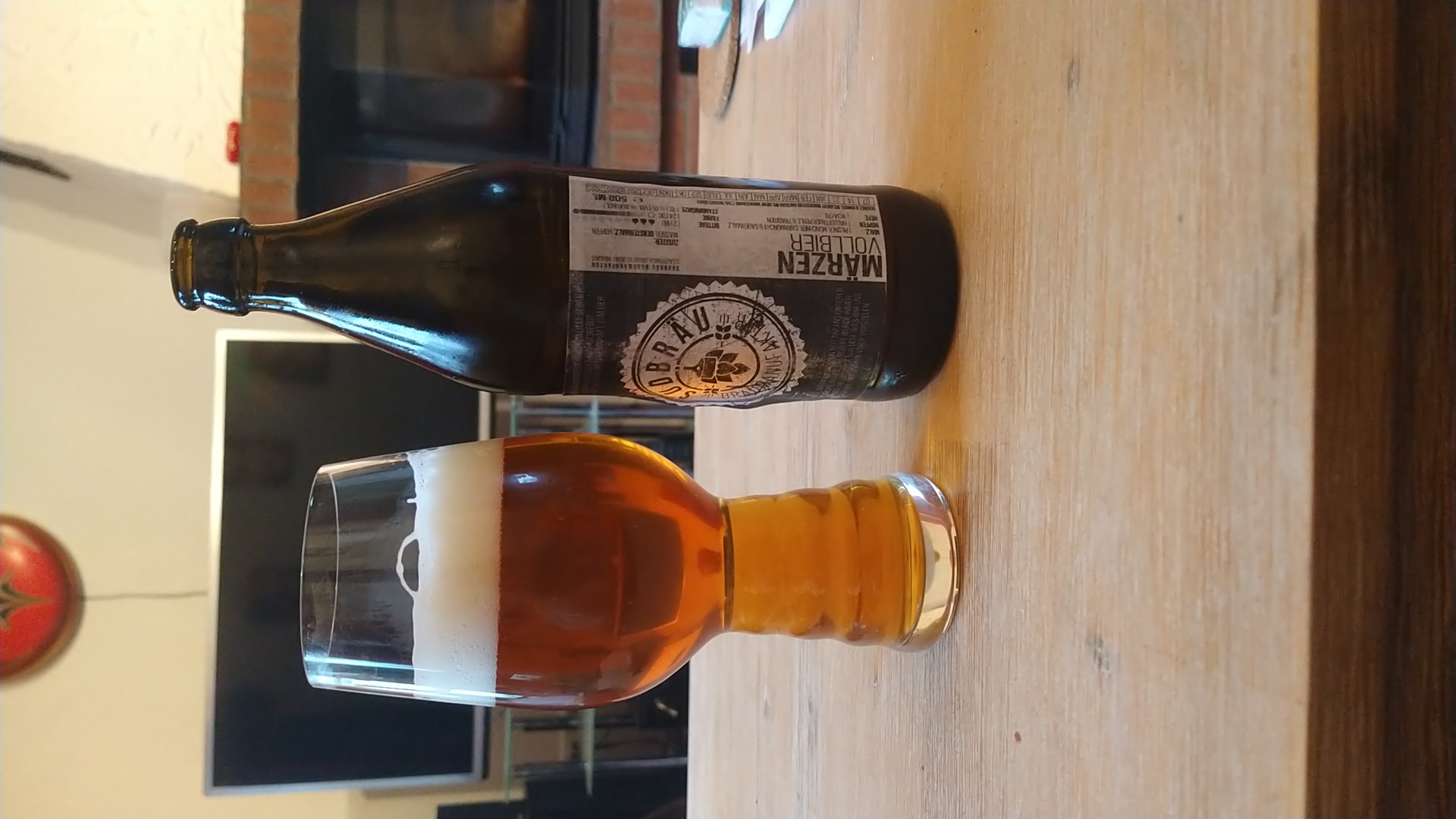 Bier leicht trüb, orange-rötliche Farbe. Schaum gut.