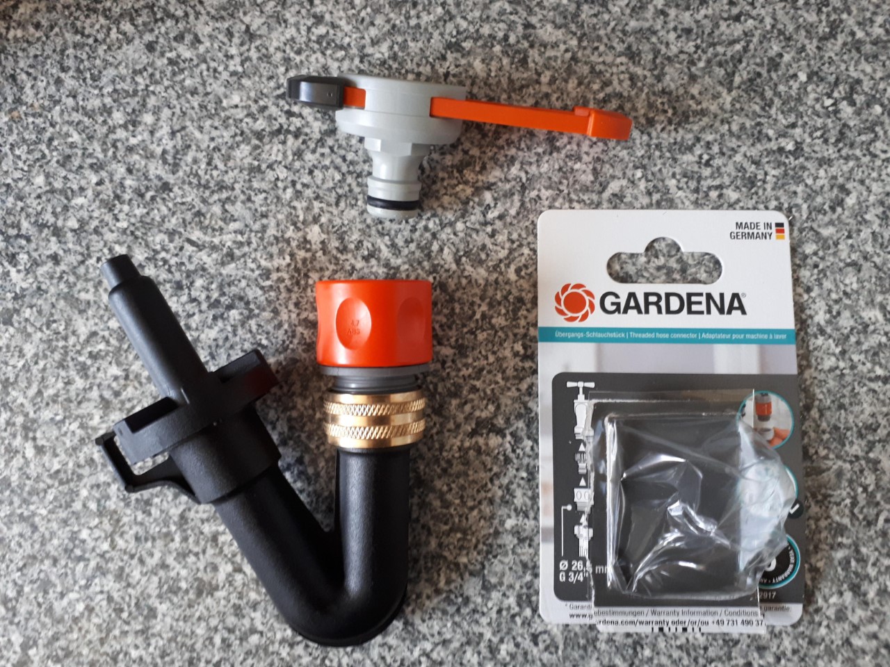 Nach dem erneuten Hinweis auf die Gardena-Adapter, habe ich jetzt mal einen 3/4“ auf 1/2“ Adapter aus Kunststoff ausprobiert und siehe da – er passt.