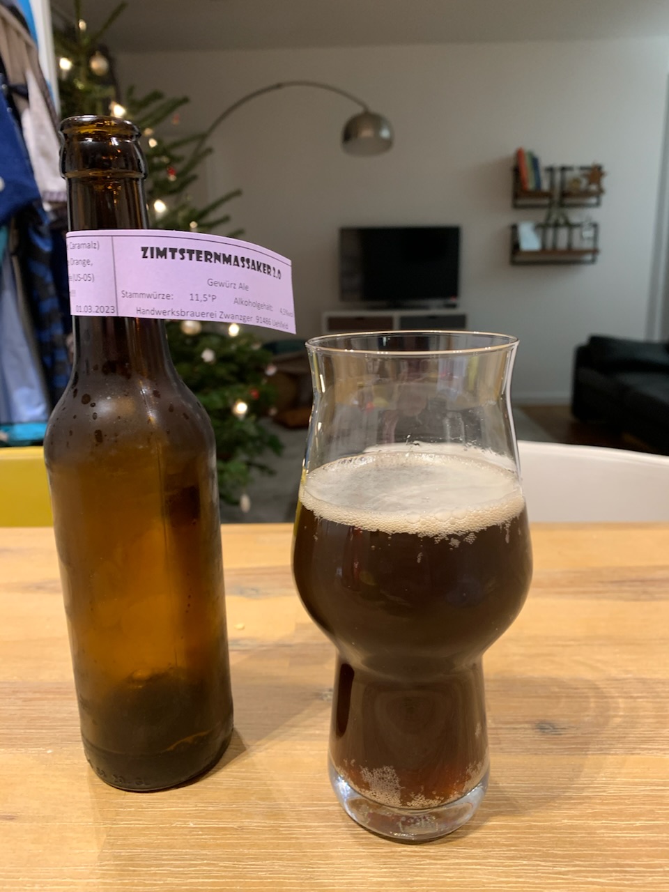 Spätestens am ersten Weihnachtstag habe ich meistens die maximale Sättigung mit Zimt, Anis und allen anderen typischen Weihnachtsgewürzen erreicht und nichts mehr in dieser Richtung ertragen. Das "Zimtsternmassaker 2.0", ein Gewürz Ale, habe ich daher vorsichtshalber schon vor Heiligabend verkostet. Ähnlich wie beim "Büchsenöffner" von oben löst sich auch hier der Schaum schnell auf, genau ist das aber auch bei diesem Bier nicht störend. Dies steht dunkel und undurchsichtig im Glas und verströmt ein tolles Aroma von eben Zimt und allen möglichen anderen Weihnachtsgewürzen. Diese finden sich selbstverständlich auch im Geschmack wieder, sehr treffend begleitet von einer leichten Fruchtigkeit, die in der Kombination dann die Erinnerung an Glühwein weckt. Ein tolles cremiges Mundgefühl und deutliche Honigaromen. Die finde ich in diesem Bier, das so schon so viel zu bieten hat, fast etwas zu viel. Zum Schluss bildet hier eine stolze Bittere einen guten Gegenpol, der mir persönlich aber einen Tick schwächer hätte ausfallen können. Davon abgesehen ein tolles und sehr ausgewogenens Weihnachtsbier!