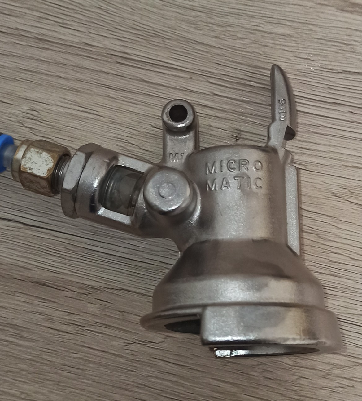 Auf dem Fitting steht „MicroMatic 0406 SK184-11“ und sieht aus wie ein kleiner Kombifitting. Dazu würde ich dann auch einen entsprechenden Zapfkopf benötigen. Was aber nur Sinn macht, wenn ich weiß, dass das System für Bier verwendet werden kann.