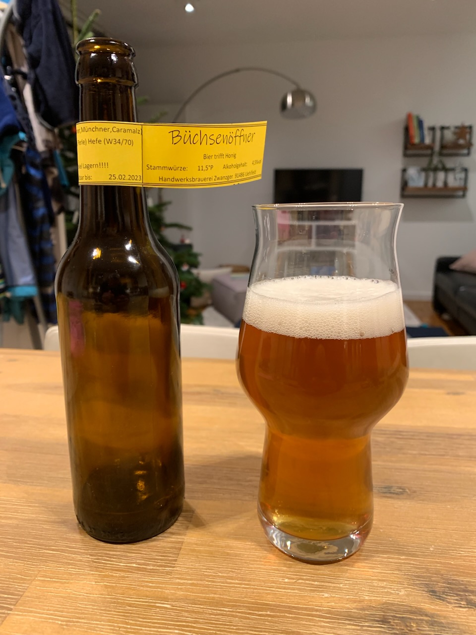Als erstes fand der "Büchsenöffner" den Weg ins Glas. Ein untergäriges Honigbier mit 8% Honig. Erster Kommentar meiner Frau: "Ooh ja lecker, das ist wirklich gut!" Somit wäre dann schonmal die Herkunft des Namens geklärt.