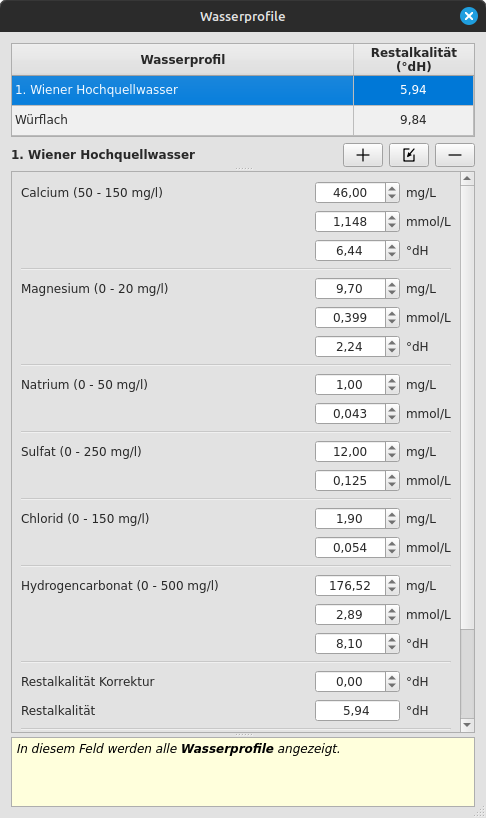 Das eigene Wasser ist recht hart, das Wiener Wasser etwas weicher. Ich lege die Profile aus dem KBH2 auch hier bei.