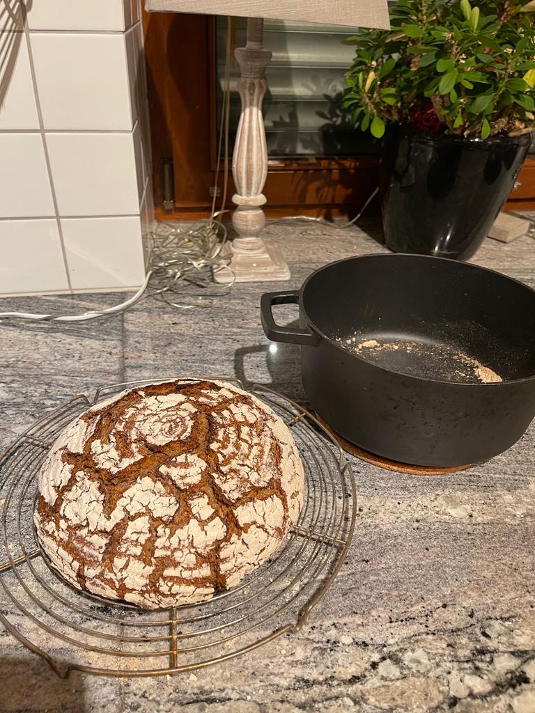 Der Teig durfte dann über Nacht in den Kühlschrank. Am folgenden Tag habe ich den Teig nochmal bei Zimmertemperatur eine Stunde gehen lassen und anschließend im Dutch Oven bei 250°C für 1std und 10m gebacken.
