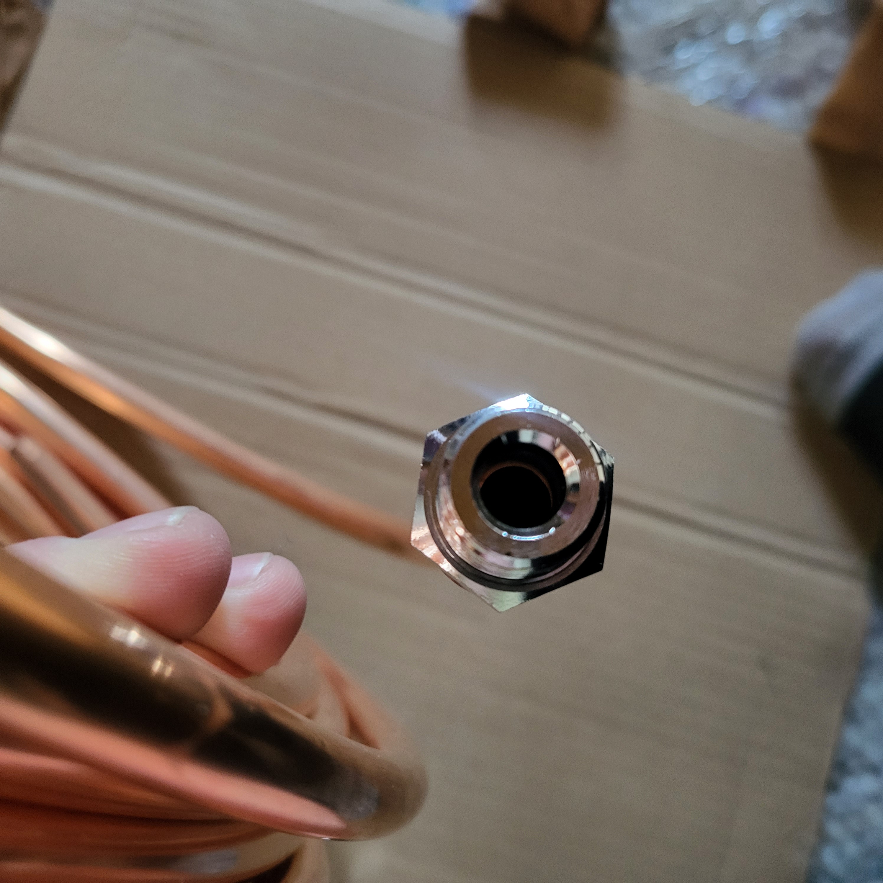 Jetzt staune ich allerdings etwas blöd weil die Schneidringverschraubung 10mm auf 1/2“ einen ID von nur 8mm hat. Da bekomme ich natürlich kein 10mm Kupferrohr durch!