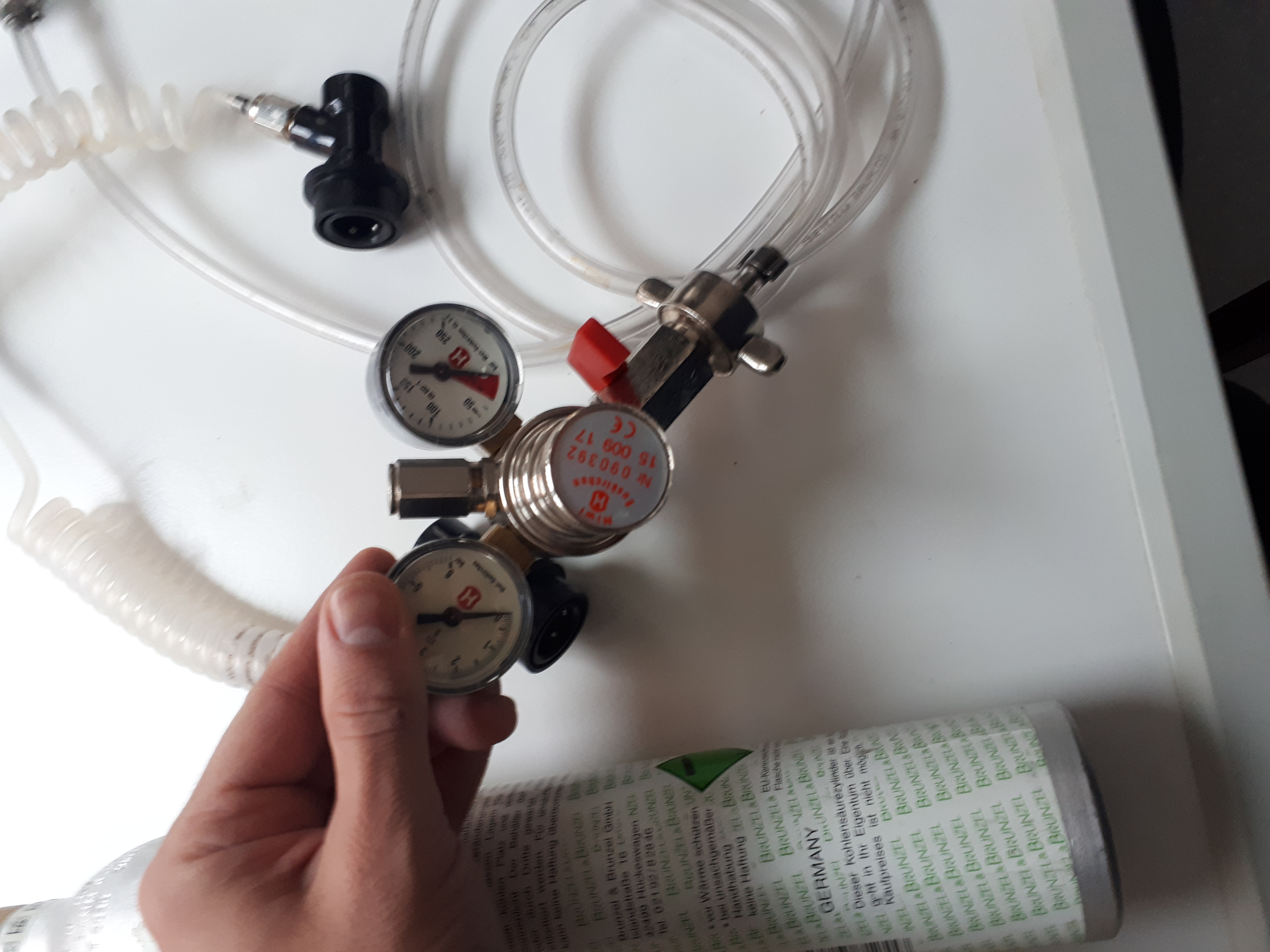 Wenn du keinen vernünftigen CO2 Händler in der Nähe hast, dann tun es auch die Sodastream Flaschen. Ist zwar ein bisschen teurer, dafür aber quasi überall verfügbar. Ich habe mir zum Start jeweils 2 CO2 und Getränkekupplungen und 10 Meter Bierschlauch gekauft und die passenden Schläuche selbst konfektioniert.
