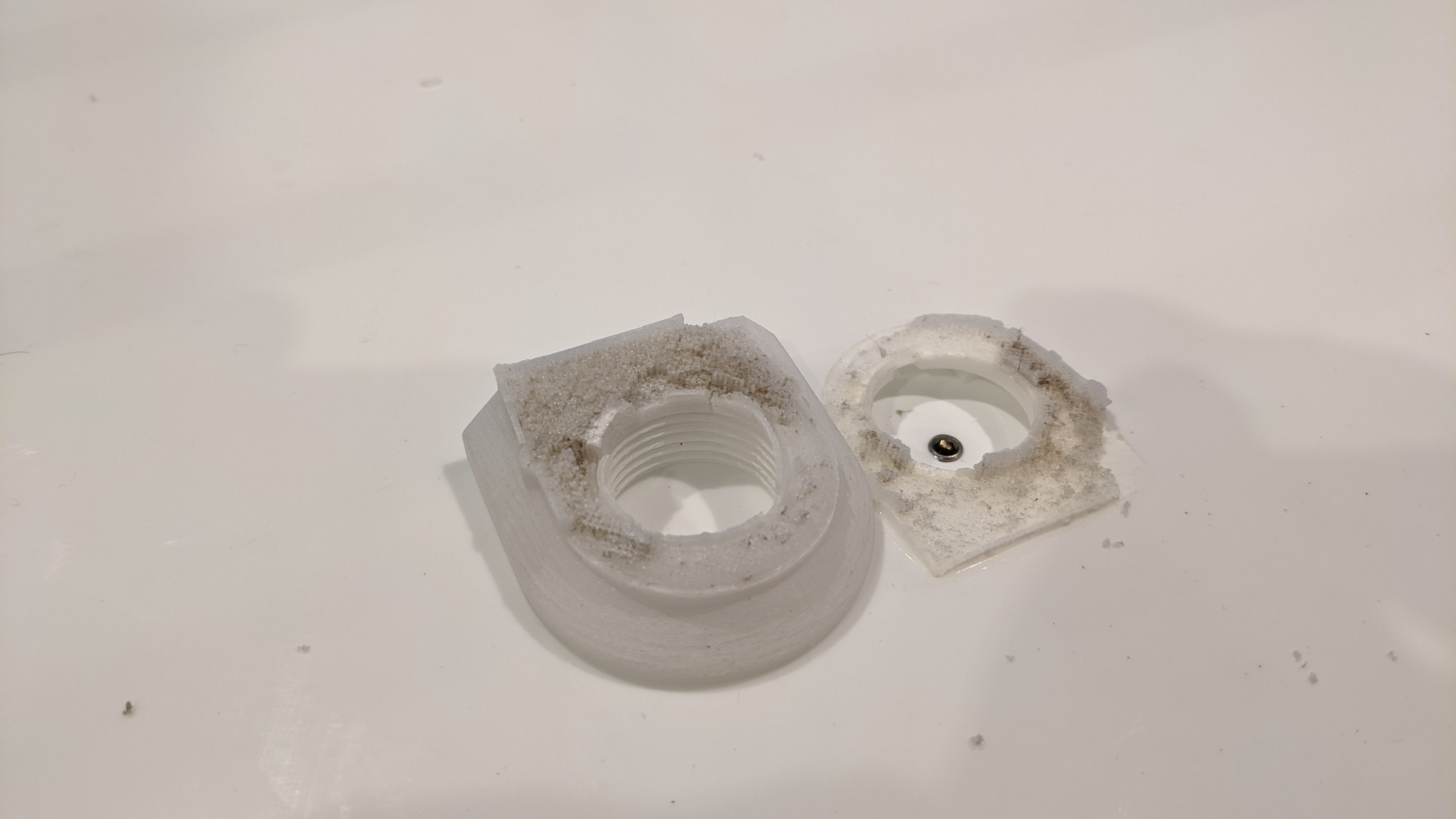 Das 3D-Druckteil sieht ganz so aus, als würde es sich in Wasser (heißes Wasser in Verbindung mit den Reinigungschemikalien) so langsam auflösen. Es ist sehr spröde und hat sehr viele Risse. Macht auch im Adapter den Eindruck, als könnte es geschrumpft sein.
