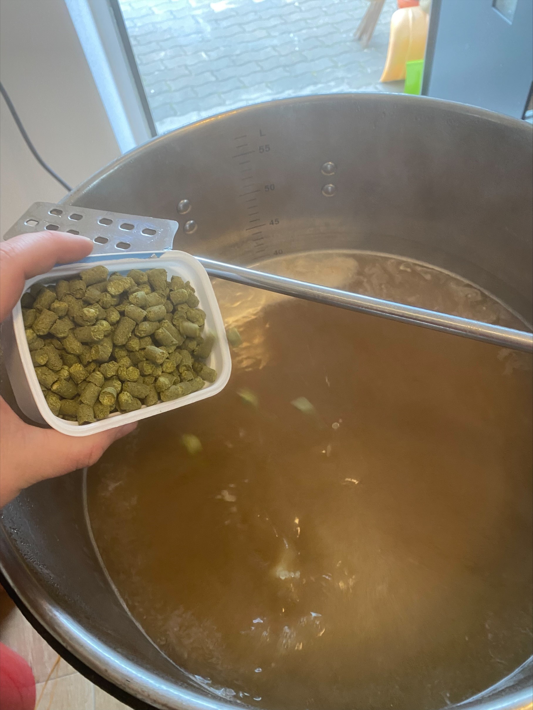 Nun hochgeheizt und dank Yato auch wallend gekocht. Aufgrund der zu niedrigen Stammwürze von gut 1,5 Grad zu wenig habe ich die Kochzeit um 30min verlängert.