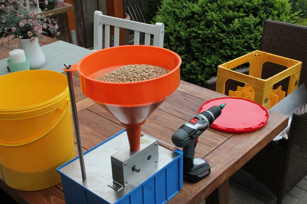 Ok, am nächsten Tag dann aber, rechtzeitig vor dem Einmaischen. So sieht das gute Stück aus: Alles bereits im Set enthalten: der Trichter, der mit einer Stange und zwei Flügelschrauben an der Platte befestigt wird, und die blaue Box als Auffangbehälter. Nur ne Kurbel ist nicht dabei... also frisch ans Werk mit dem Akkuschrauber: Auf die Uhr gesehen hab ich nicht, aber die 5 kg Malz habe ich in einer akzeptablen Zeit geschrotet. Durch den Behälter staubt da auch nix. Alles super-easy. Und so ist das Ergebnis: Für braumeister o.ä. vielleicht ein zu hoher Mehlanteil? Für mich (ich läutere mit dem Läuterator) aber perfekt!