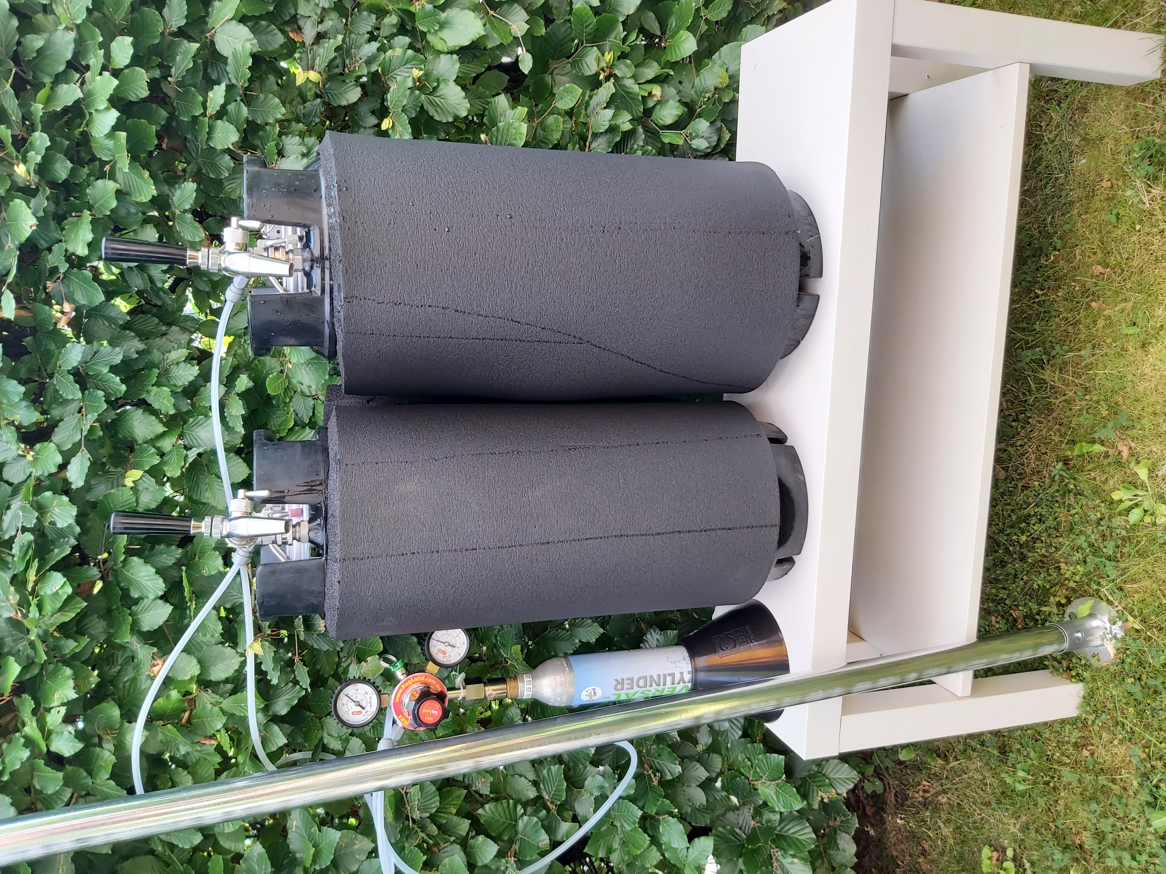 Ausgangslage: 2 19l Kegs vorhanden, maximal noch ein drittes kommt dazu (für hard seltzer oder Sprudelwasser). Co2 kommt aus der Sodastreamflasche, eine 10l Steigrohrflasche ist vorhanden. 2 Kegs bekommt die Sodastreamflasche gut gedrückt, das dritte Keg sollte auch noch passen. Dazu zwei Kompensatorhähne. Bisher wurden die Kegs in einem Gastrokühli (draußen im Gartenhaus) vorgekühlt, 2 Stunden vor der Party entnommen, in Armaflex eingewickelt und zu einer provisorischen Zapflösung aufgebockt. Das ist günstig und kostet erstmal wenig Platz, führt aber dazu, dass der Gastrokühli erst 2 Stunden vor Partybeginn mit den Softdrinks bestückt werden kann.