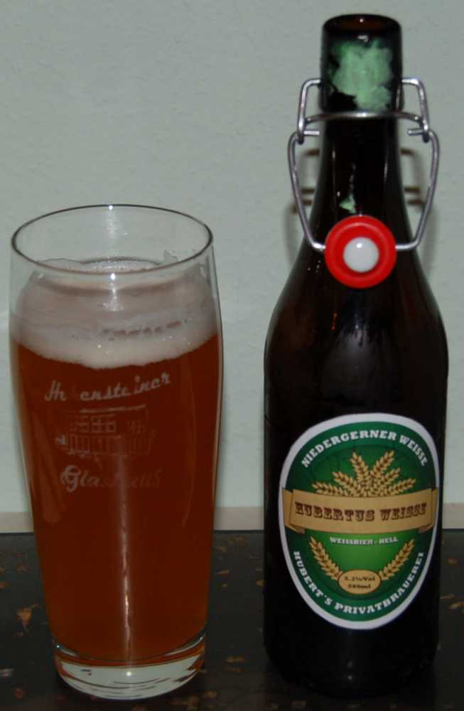 Heute gab's die Hubertus Weisse, ein gehaltvolles und wie ich finde typisches Weizenbier. Als Hopfen ist Saphir angegeben, aber ich rieche in erster Linie Banane. Gut gelungen, nur die Angaben auf dem Klebeetikett sind komisch. Als Karbonisierung werden 6,5% genannt, das ist sicher nur ein Schreibfehler.