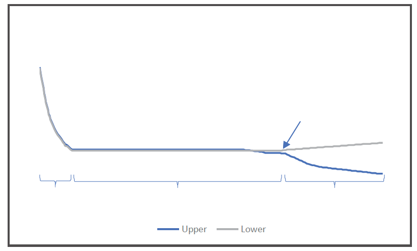 Die Temperatur, bei der sich das Temperatur-Dichte-Verhältnis umkehrt, nennen wir den Inversionspunkt und liegt bei Bier zwischen 1 und 4 °C. Wird eine Fermenter-Solltemperatur von unter 6°C eingestellt, kann der Fermenter diese Temperatur zunächst erreichen und sogar für einige Zeit eine einigermaßen gleichmäßige Temperaturverteilung beibehalten. Es ist jedoch wahrscheinlich, dass irgendwann, während das Kühlsignal eingeschaltet ist, das direkt an den Mantel angrenzende Bier (im oberen Bereich) unter den Inversionspunkt fällt.