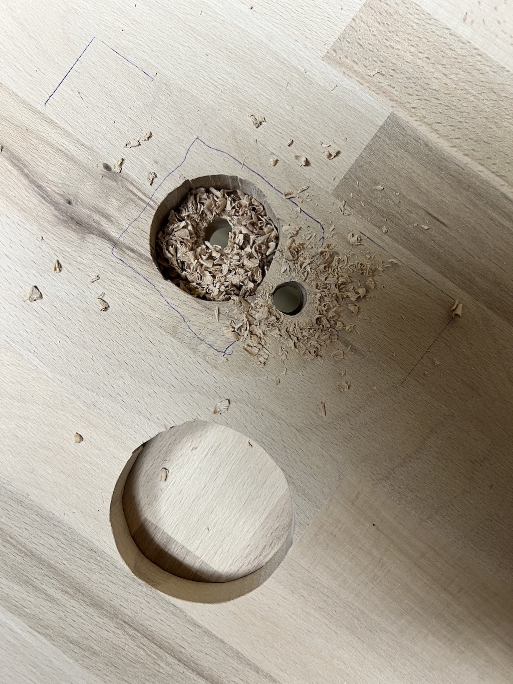 Hier Bilder der verleimten Rohlinge: Es gibt 3 Bohrungen auf der Grundplatte. Eine für die Gasleitung, eine für die Bierschläuche und eine "halbe" als Standhilfe für die Gasflasche (also nur eine der beiden Grundplatten bearbeitet): Bohrungen der Hahndurchgänge: Bohrung durch die Kühlschrankdecke: Innenleben: Der Gasverteiler ist innen angebracht, dort wo später das 10 Liter Keg hin kommt: Um 4 Fässer rein zu bekommen musste ein Teil der Türisolierung weichen (muss noch versiegelt werden): So aufgereiht passen sie gerade so hinein. Wobei eine Seite der Gummigriffe des Fasses ganz rechts etwas nach innen gebogen ist (wie auch immer das geht). Ich hatte es geschenkt bekommen und nun kommt mir dieser Schönheitsfehler sehr gelegen, weil genau dort die Temperatureinstellung sitzt: Das eingedellte Fass, leider nicht so gut zu erkennen: Hier noch die Gasflasche in der Säule: