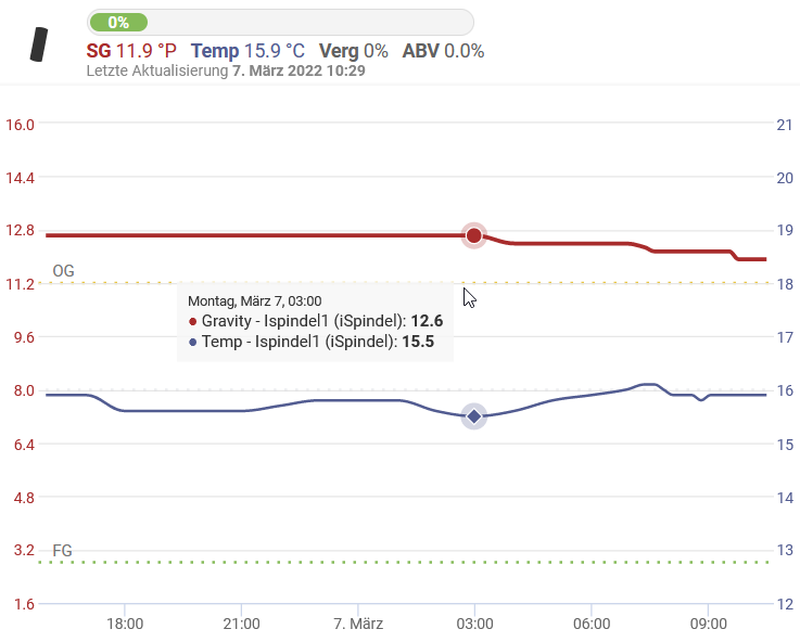 Angestellt vor 44h bei 9 Grad, auf 10 Grad Gärtemperatur kommen lassen. Schnell angekommen. Schöne (Nieder-)Kräusendecke, der blow off blubbert in einer Tour. Extraktabbau nimmt gerade auch Fahrt auf, laut Tilt gerade bei 9,4 RE (von 11,6 P StW). Läuft.