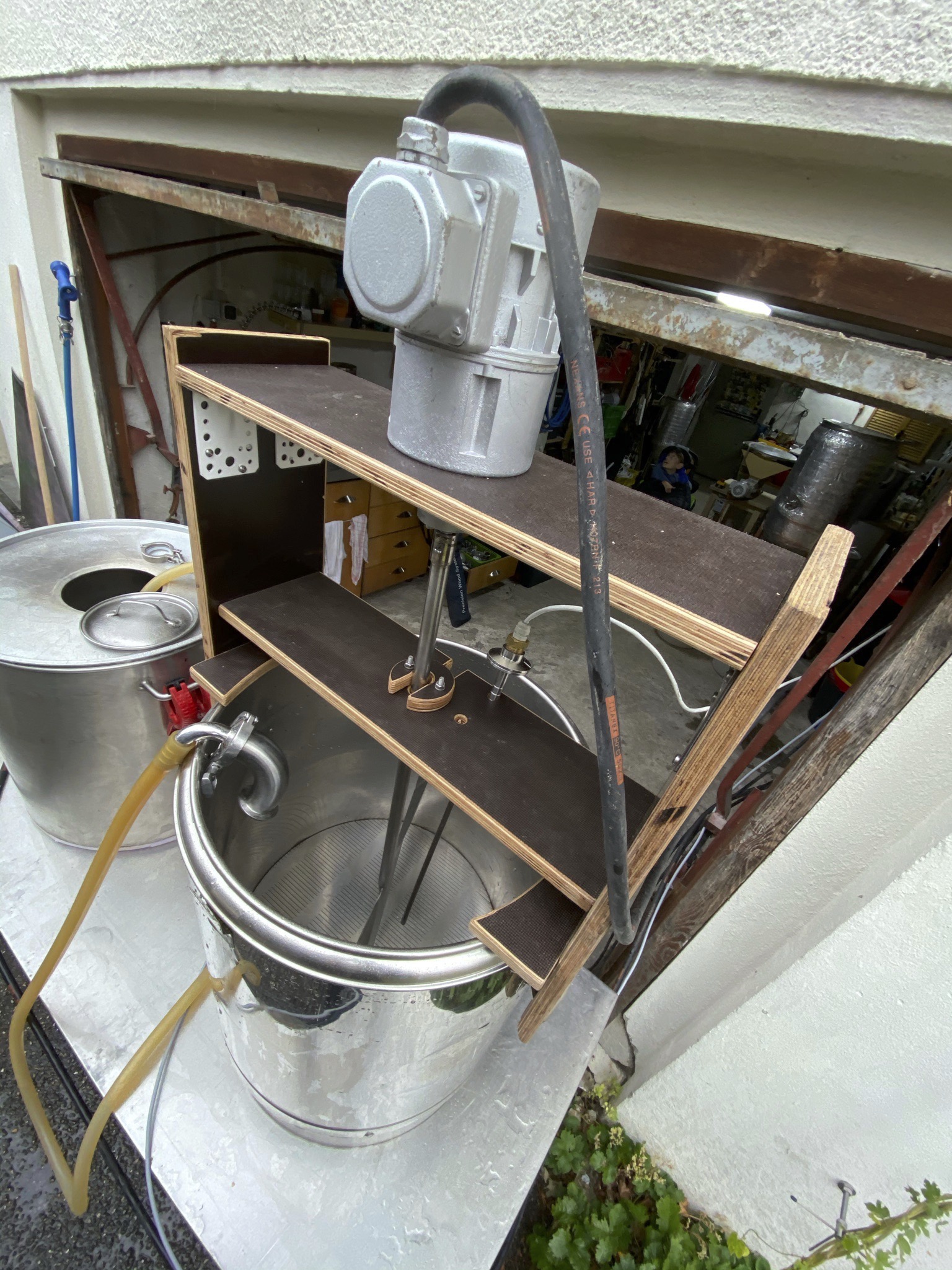 Der fette Holzverschlag auf dem Thermoport ist der Ständer meines Rührwerkes, nicht so elegant, aber dafür hässlich. Wenn ich weiss, wie die Rührwerkslänge sein muss, wird das edelstahlifiziert. Ausserdem hat sich der Motor als etwas schwachbrüstig für meine Mengen herausgestellt (ex Milchrührwerk), das gibt es bald zu verkaufen. Impressionen