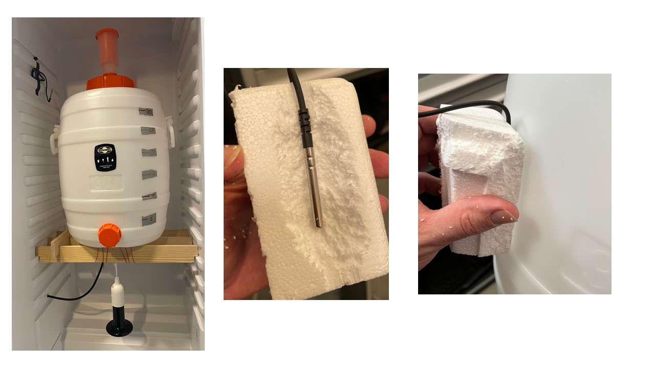 Zum Umschlauchen vom Kessel in den Gärbottich zog ich den Sud von oben mittels Heber ab und plätscherte den süßen Saft auf die zuvor aufgeschwenkte und vorgelegte Hefe. Das Ergebnis kann sich meiner Meinung nach sehen lassen, denn der Trub blieb dort … nämlich im Kessel. Die Anstellwürze betrug 27ltr. Abschließend plumpste ich den TILT noch rein und gab das Gärfass mit außen angeklebten Temperatursensor in den Kühlschrank. Stammwürze vor Start Gärung betrug 12,4°P und war somit etwas niedriger als das Ziel von 13. Nach ca. 40h zeigte sich am Gärspund eine gleichmäßige Aktivität. Das Setup im Kühlschrank habe ich übrigens von Leuktal Bräu hier nachgebaut.