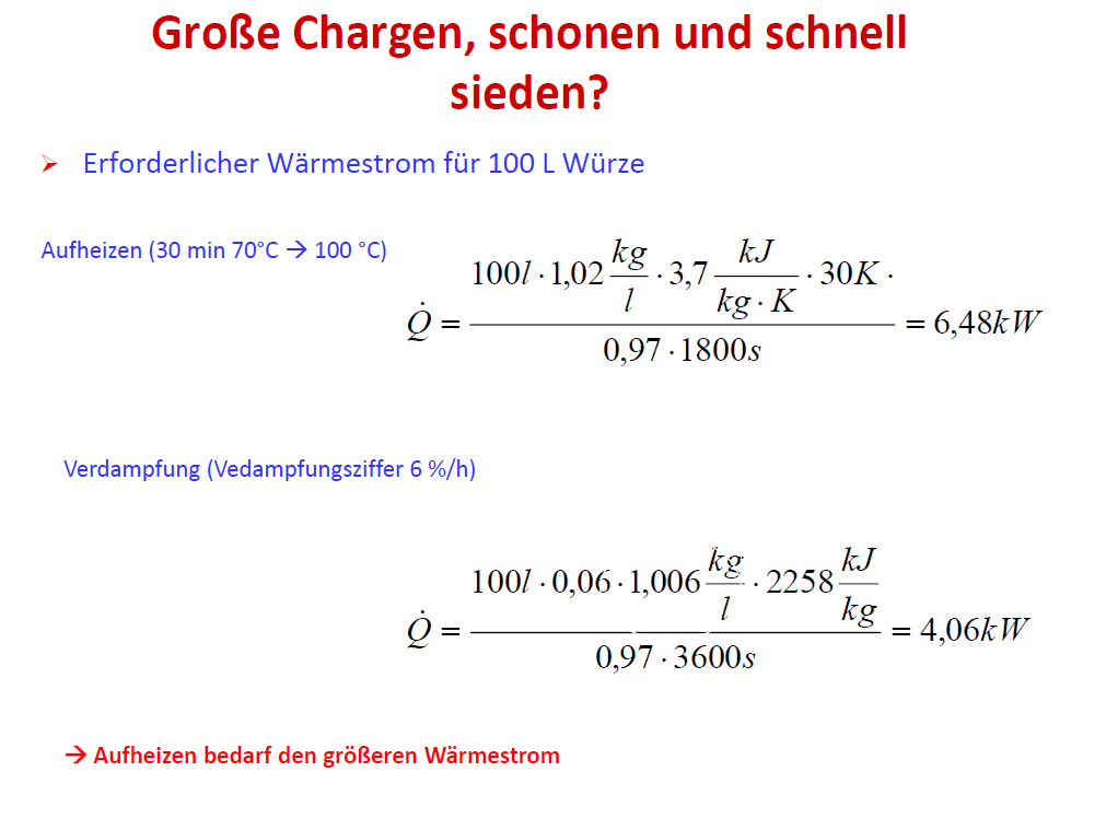 Um 100L von 70 auf 100°C zu erwärmen bedarf 6,4 kW und um eine Stunde die Würze zu kochen mit einer Verdampfungsziffer von 6%/h bedarf 4 kW.