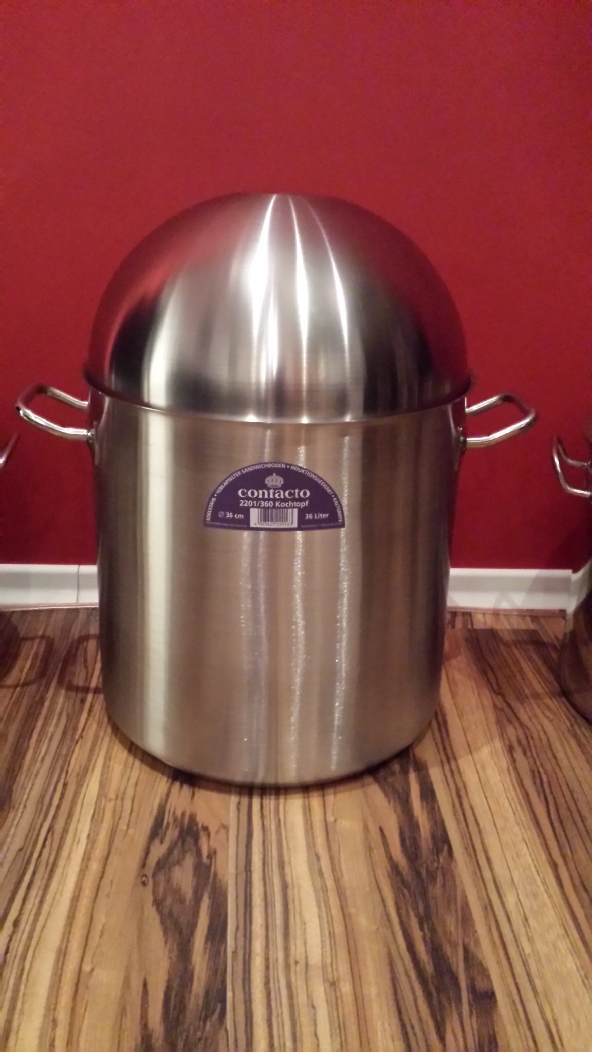 bei Ikea gibt es eine Edelstahlschüssel Blanda Blank mit 36cm Durchmesser für 11,99€ die man für den Bau einen Brüdenhaube nehmen könnte. Das Material ist Edelstahl, allerdings magnetsich und möglicherweise schlecht schweißbar. Auf den Contacto 36l Topf passt sie ganz gut: