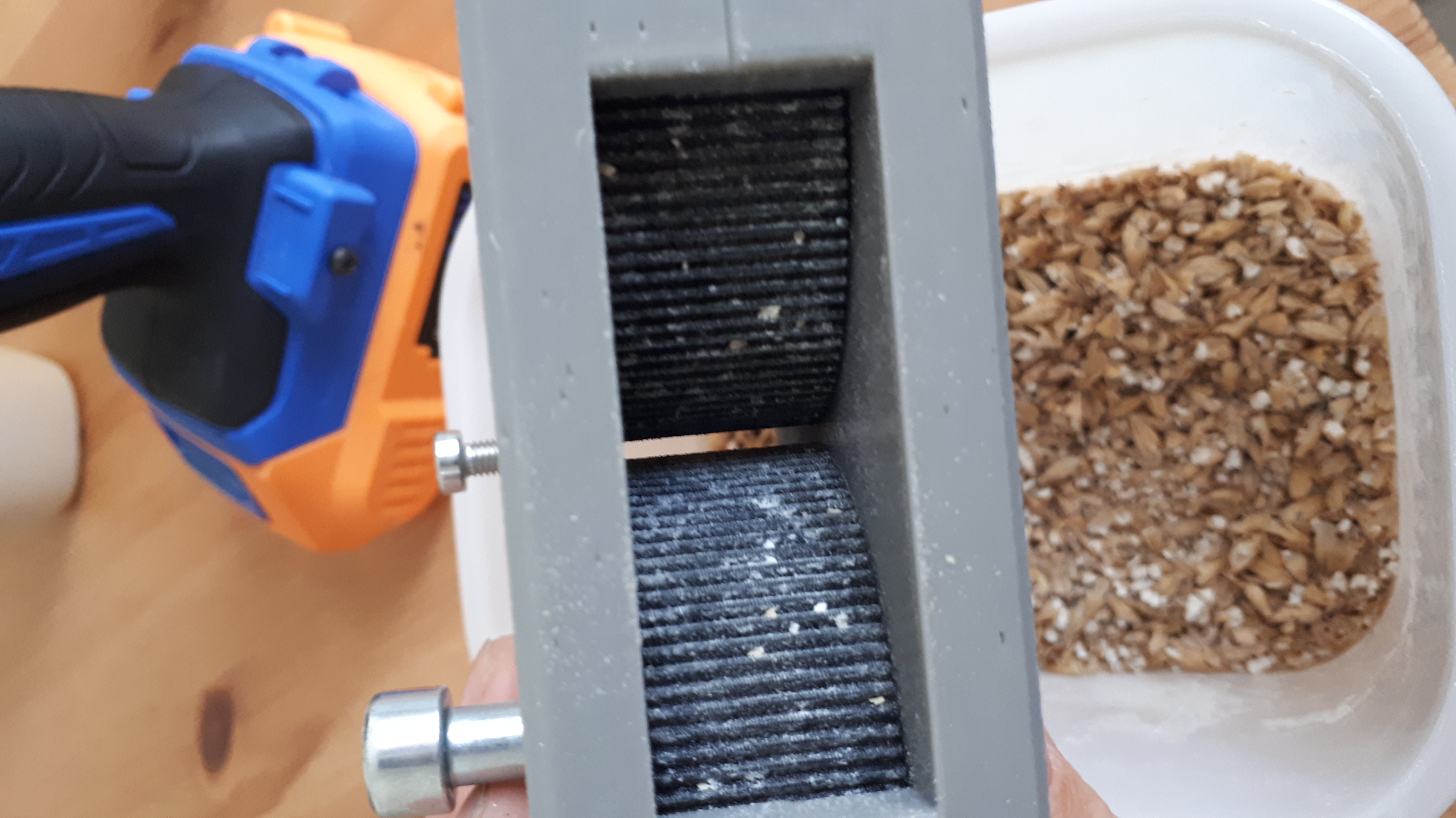 • der Durchsatz beträgt ca 1kg Malz / 2min. Ich hatte den Akkuschrauber im 1. Gang laufen, aber meist nicht auf voller Geschwindigkeit (lieber etwas vorsichtig) - gut Möglich, dass es auch noch schneller geht