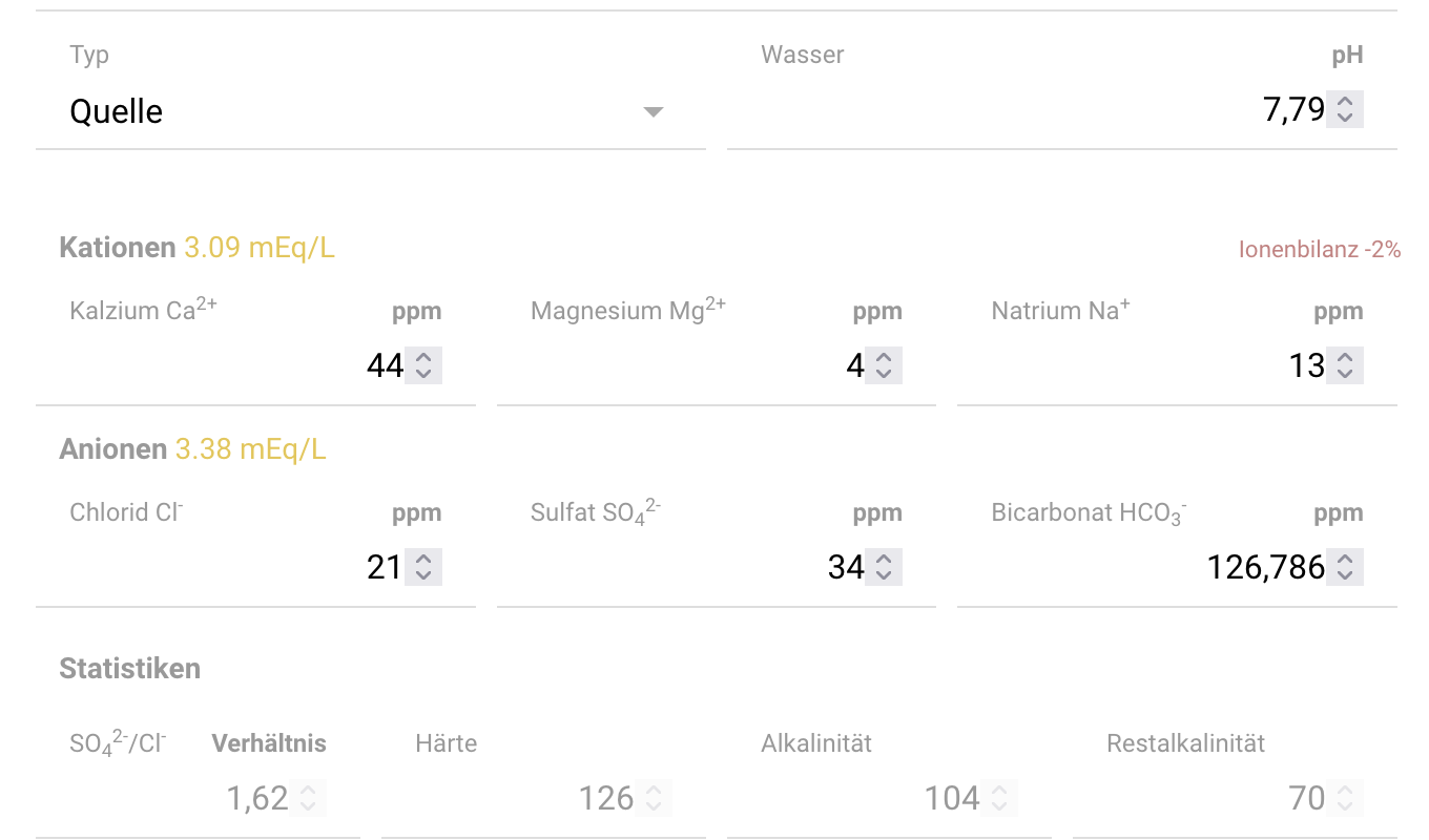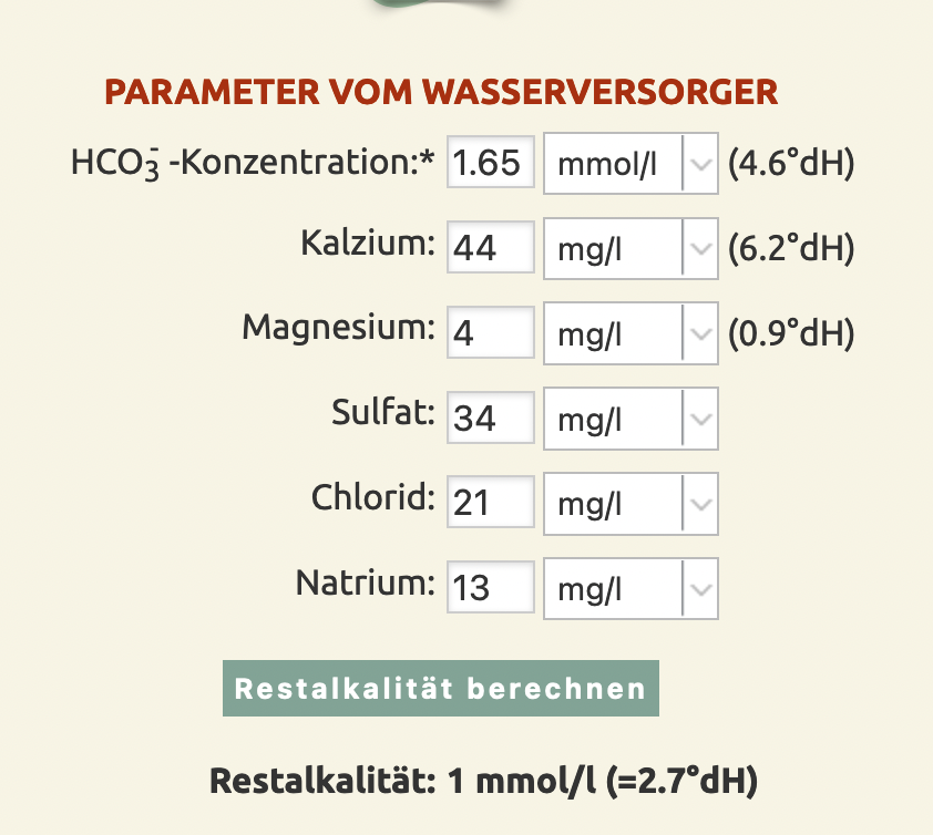 *Falls relevant, hier mein Wasserprofil lt. Wasserversorger und die resultierende Restalkalität
