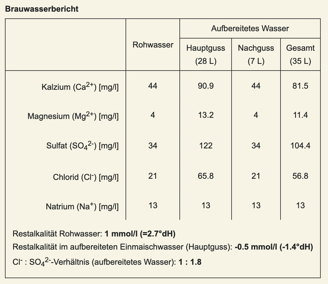 Sebasstian hat geschrieben: Sonntag 8. Mai 2022, 20:11 Dein Wasser ist eigentlich ganz schön. Ich kann das so bestätigen (mit Schlupfs Wasserrechner gegengeprüft): Für 30 Liter Wasser gibst du 7ml Milchsäure dazu und liegst eigentlich schon ziemlich gut für eine 100% Pilsner Malz Schüttung. Für die Wasseraufbereitung spielt es erstmal keine große Rolle welche UG Hefe du verwendest und wie du das Bier nennen willst.