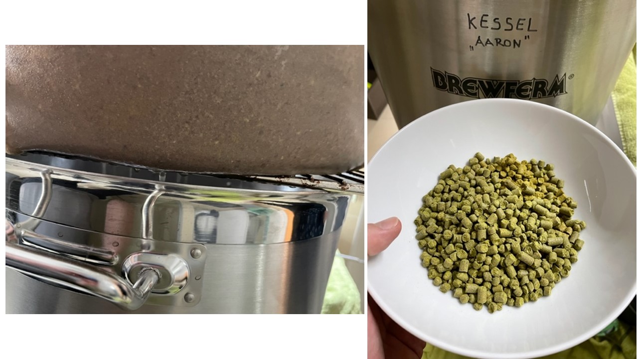 Keinerlei Hopfen vor oder während des Kochvorgangs. Stattdessen kühlte ich nach 60min Kochdauer den Bräu auf 70°C herunter und gab dann wie folgt hinzu: