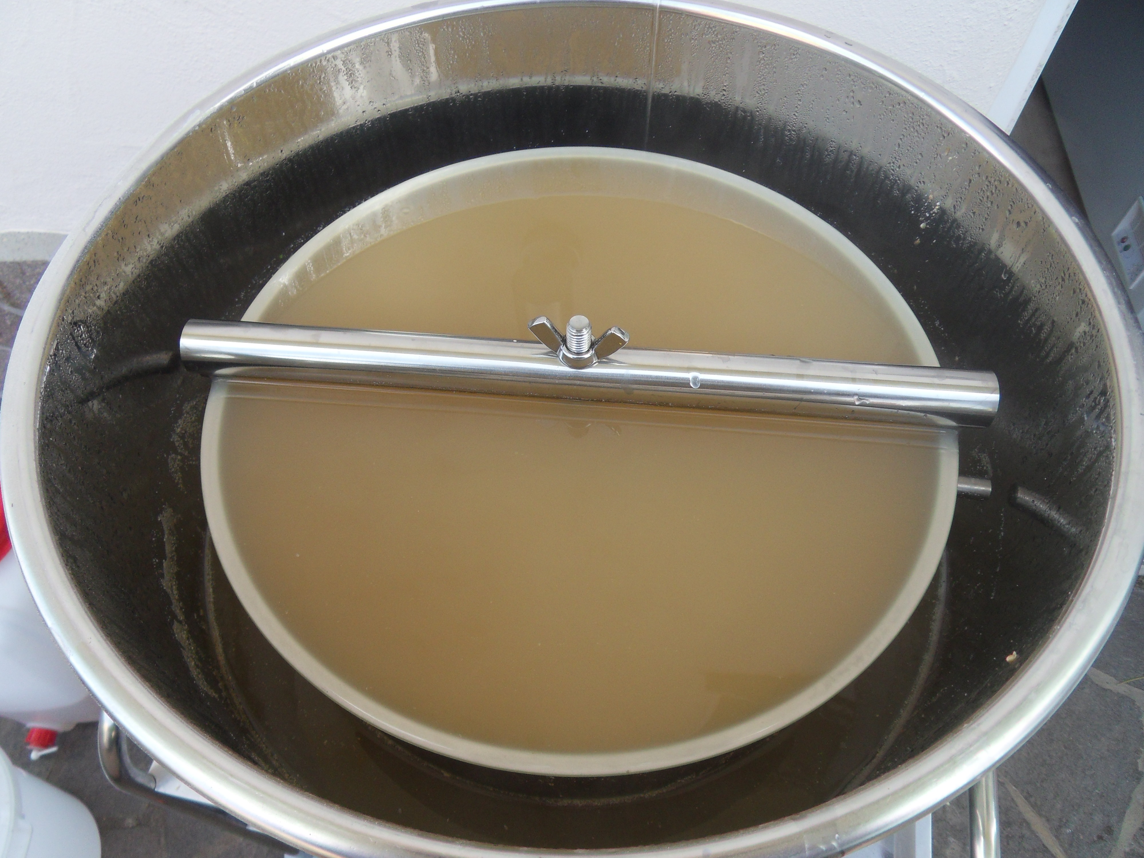 Zum Einsatz kommen einige Neuerungen bei mir: die Abfüllpistole z.B. oder auch eine neue Art des Abziehens von oben, die ich mir überlegt und gebastelt habe. Bei Erfolg würde ich möglicherweise hier berichten wollen; da das aber in den Gardena-Bereich geht, muss ich mir das nochmal gründlich überlegen. Was noch fehlt, sind die wiederablösbaren Etiketten, die hatte ich bestellt, sind aber noch nicht da. Macht aber nicht viel, dann klebe ich wieder mit der bewährten Milchmethode, nur das Ausschneiden der ovalen Etiketten nervt doch so langsam ein wenig. Neu ist auch die Induktionsplatte mit Kochtopf fürs Anschwänzen; direkt neben dem Läuterbottich, ich erhoffe mir dadurch eine konstantere Nachgusstemperatur (auch wenn die von einigen hier als nicht so wichtig angesehen wird).