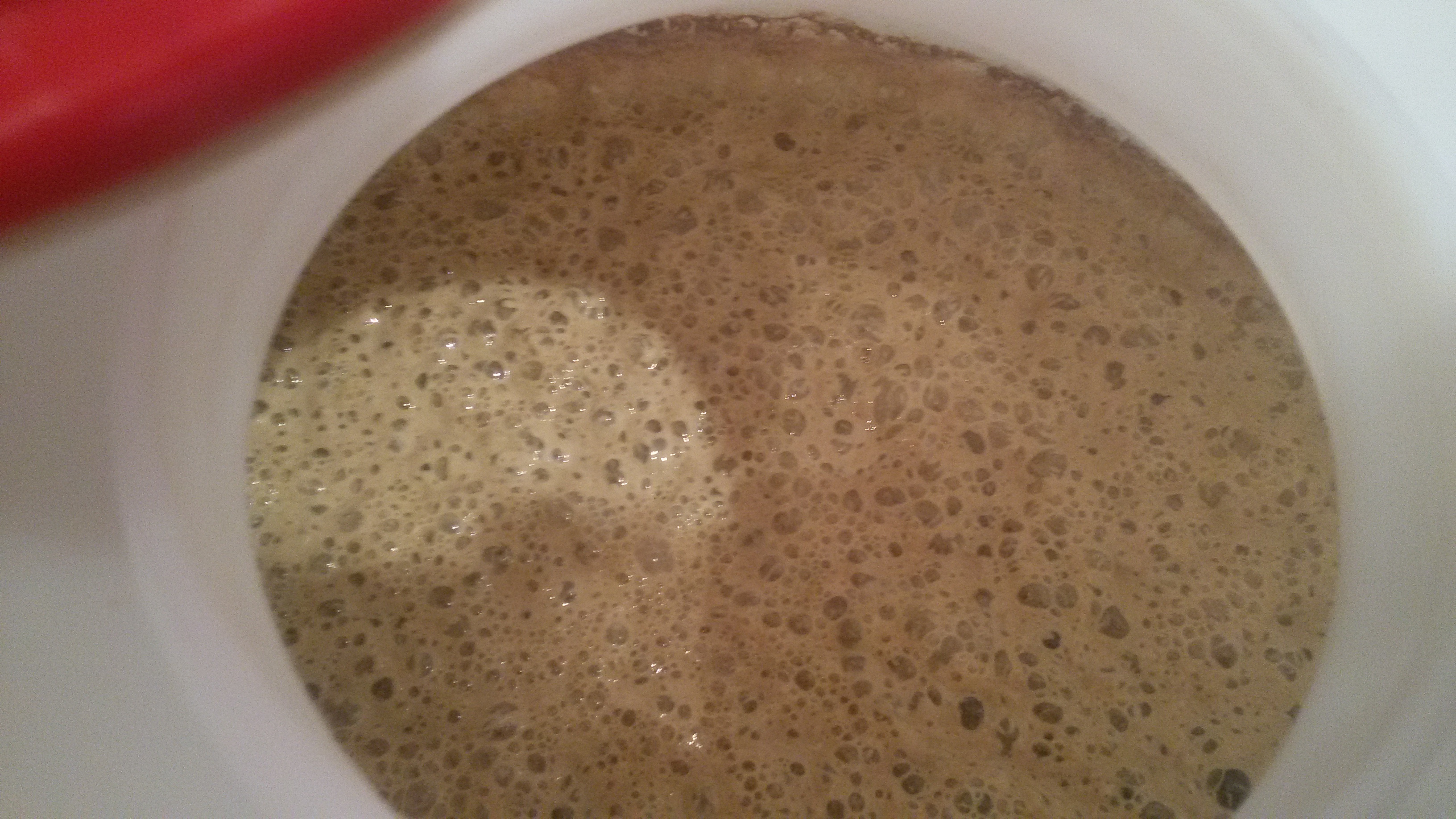Wer das Bild vergrössert wird diese glänzende, pastöse Struktur der Hefedecke erkennnen können. Diese "Hefeschicht" ist in meinem 50L-Gäreimer ca. 0,5cm dick, darunter befindet sich noch etwas Schaum der die Struktur trägt.