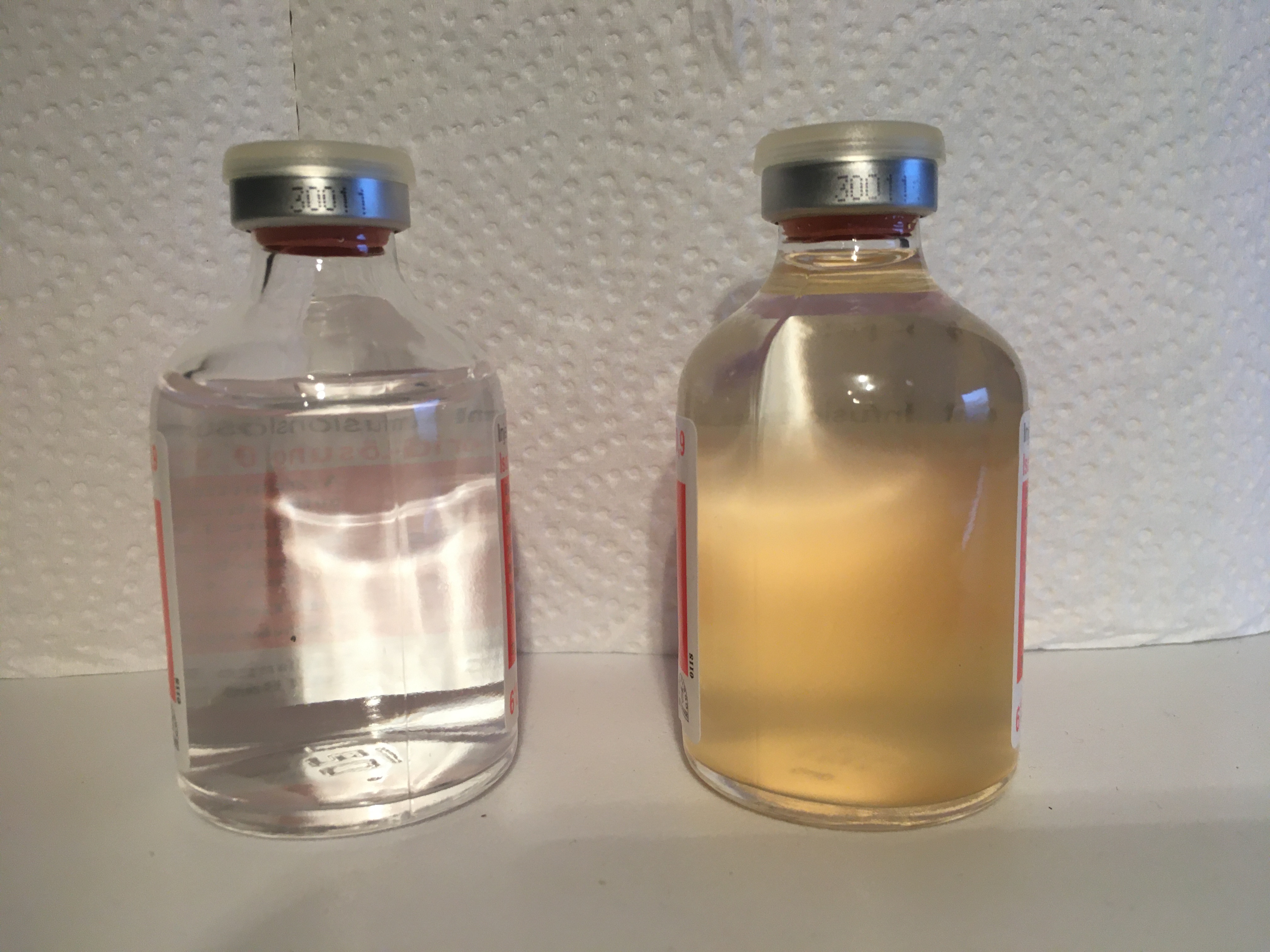 Ich bin erstaunt wie klar die Würze diesmal ist (erstmalig Irish Moss verwendet) und hoffe, dass ausreichend Hefezellen enthalten sind. Die linke Ampulle ist reines NaCl, in der rechten sind noch zus. 10ml Würze enthalten.