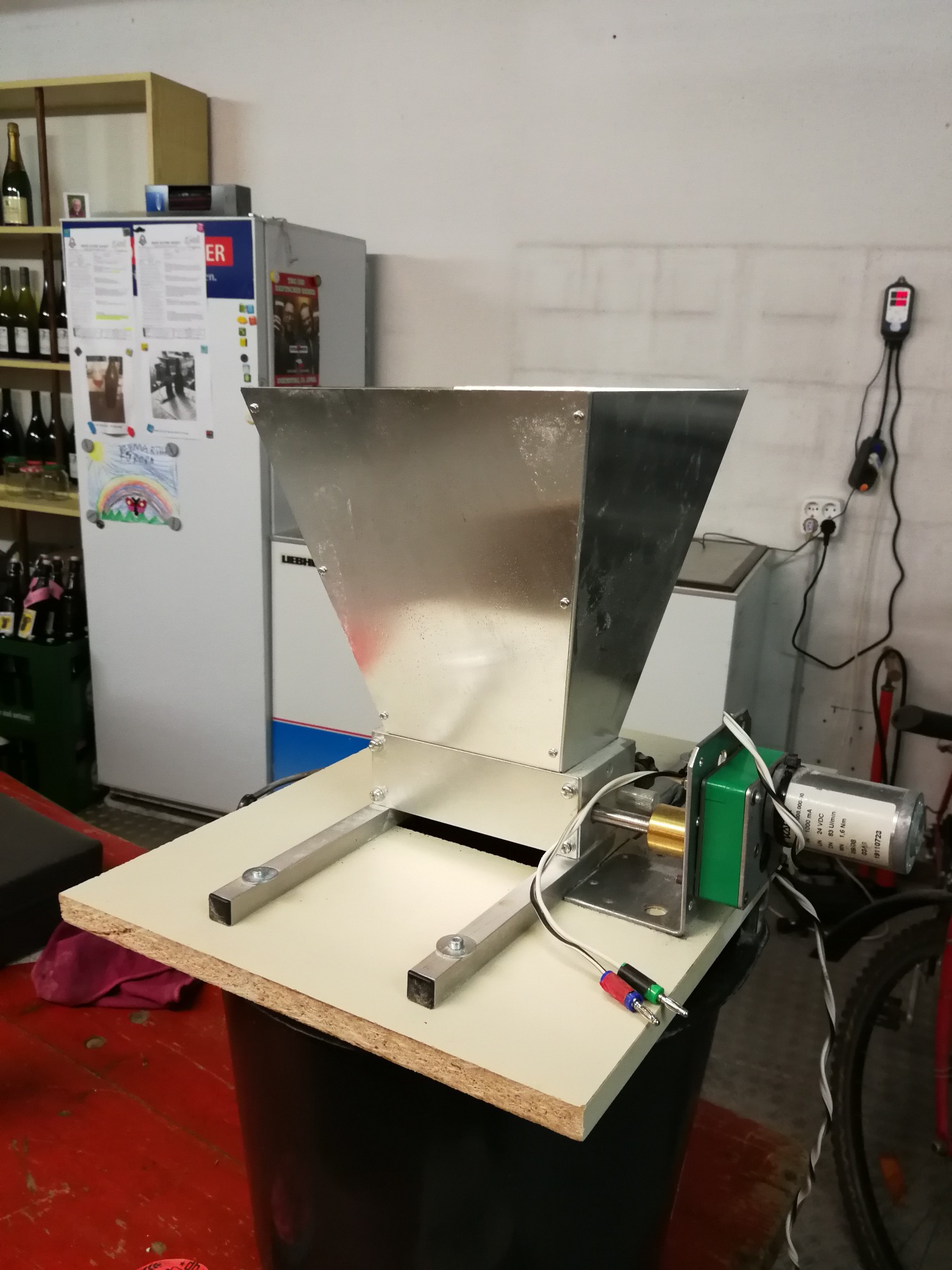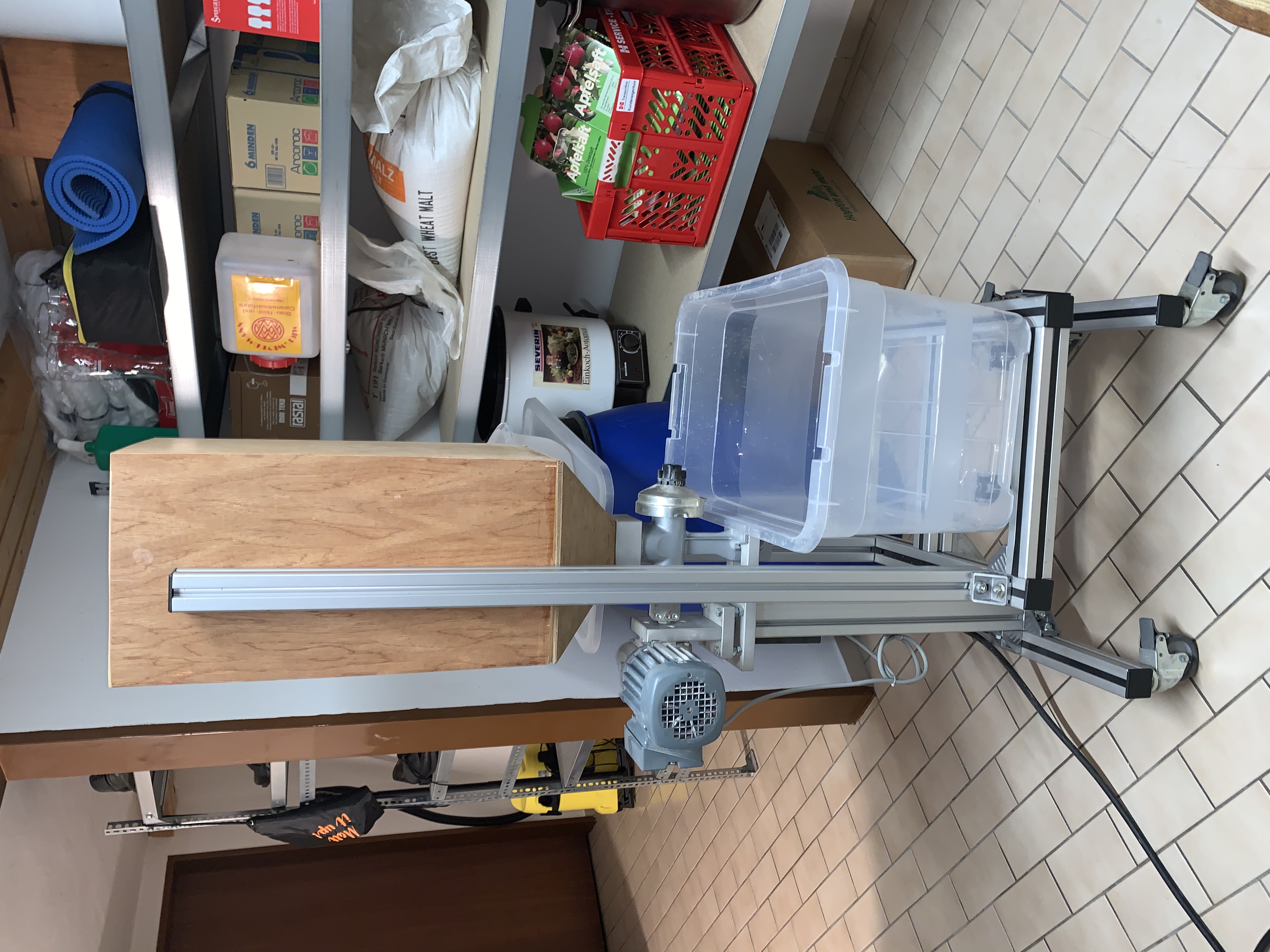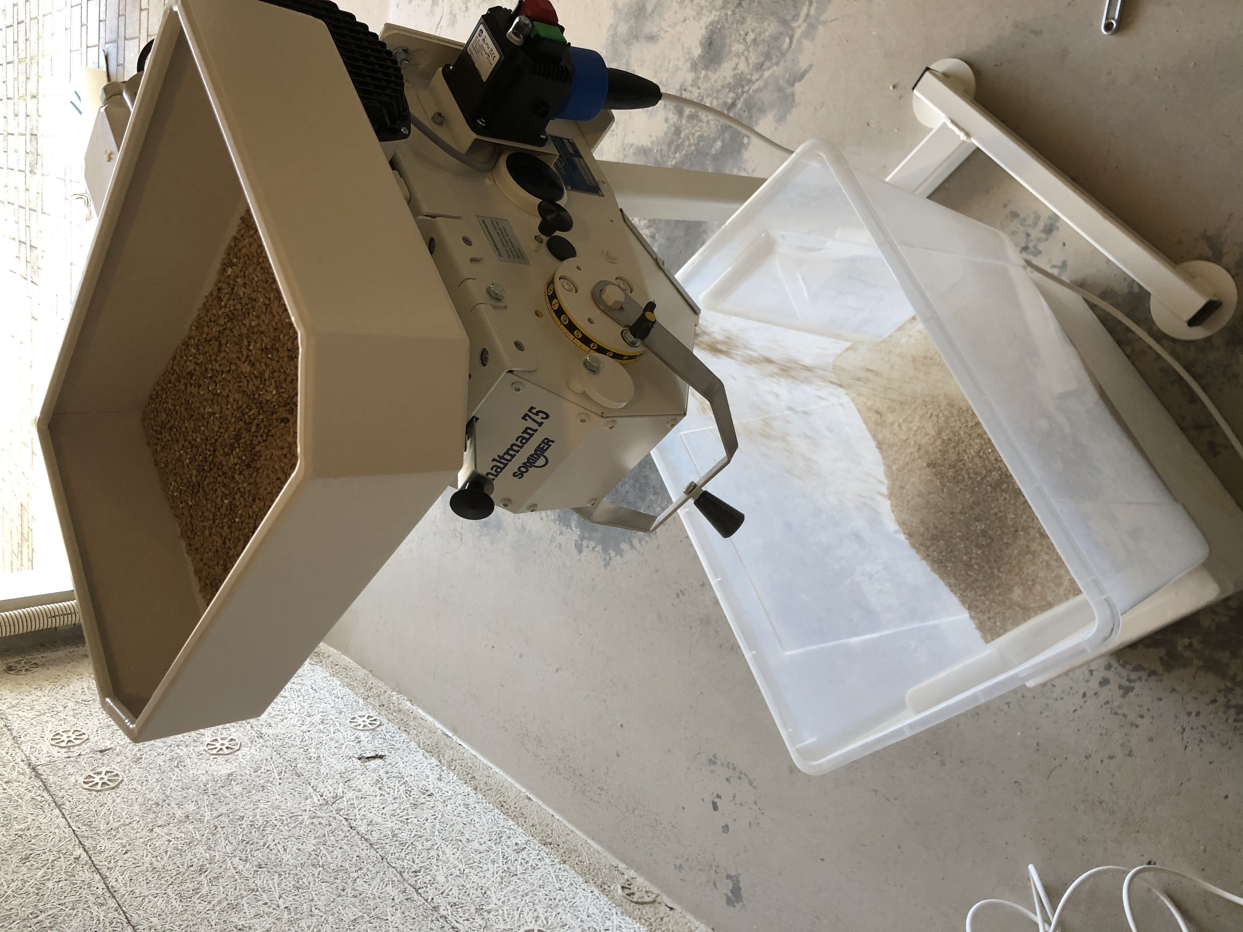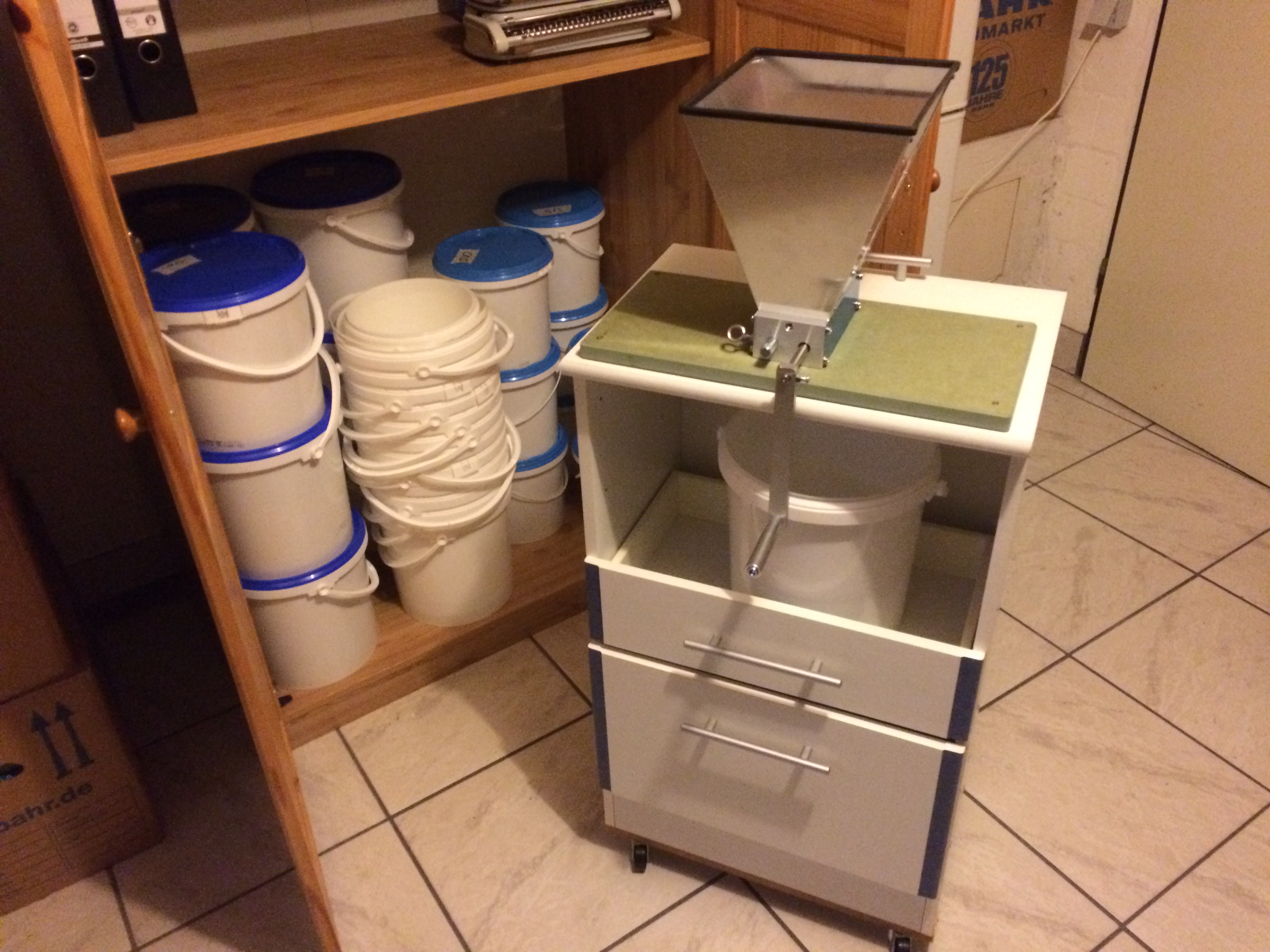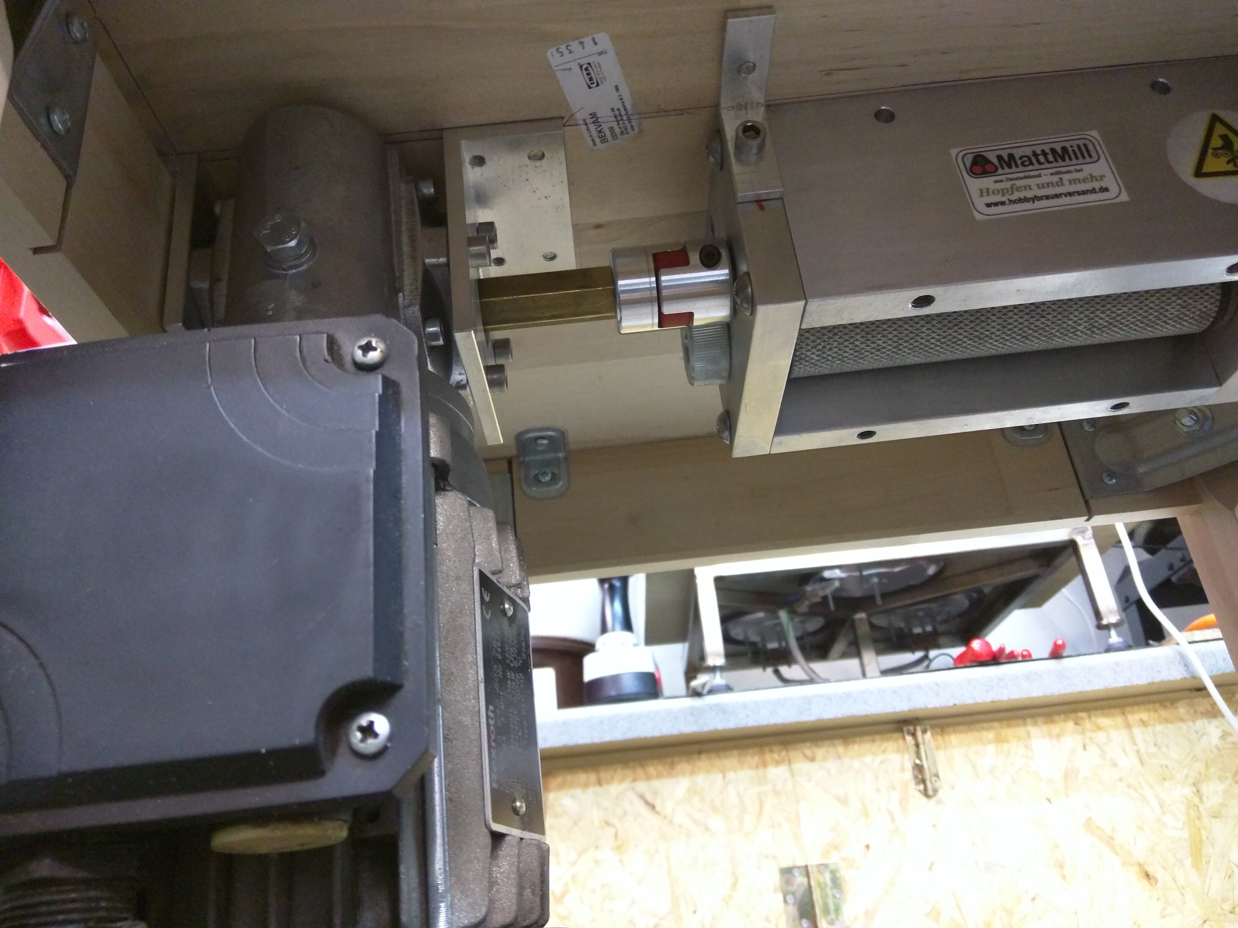 habe zwar keine MattMill, sondern eine einfache Malzquetsche, aber habe mir auch ein altes Schränkchen umgebaut. Inzwischen habe ich noch aus einem alten Malzsack eine Art Staubschutz von der Mühle bis in den Eimer angebaut. Handbetrieb ist für meine 20-Liter-Sude völlig OK.