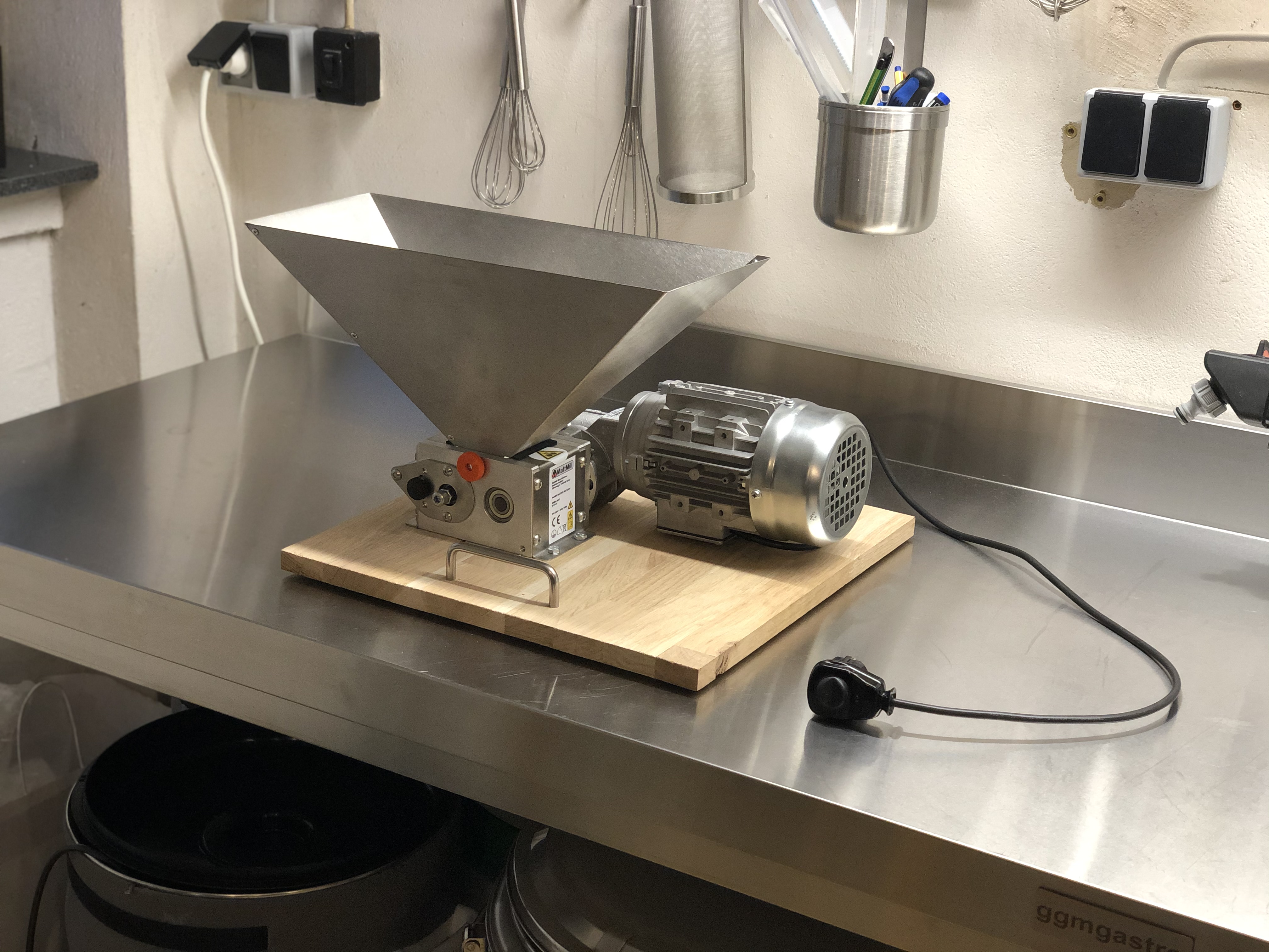 So schaut es bei mir aus: MattMill Kompakt mit sehr kleiner Box, aber genau passend für 2,6 Kg Malz (Braumeister 10). Und die Platte lässt sich samt Trichter-Adapter auf links drehen und hängt dann kopfüber in der Box. Was bei mir leider sehr schlecht geklappt hat ist das Aussägen der Aussparung...hier ist alles ausgefranst ohne Ende (sieht auf dem Foto weniger schlimm aus als es ist).