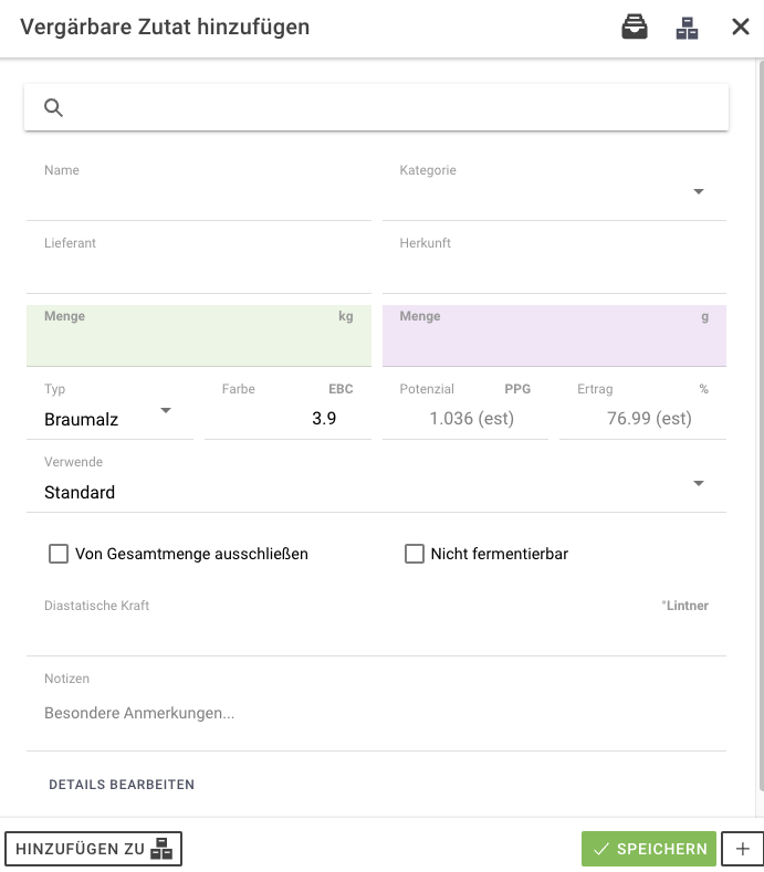 Beim manuellen Erstellen eines Rezepts wird übrigens nach einer Menge des Malzes gefragt (Prozenteingabe ist nicht möglich). Also wird vorerst ein OG berechnet.