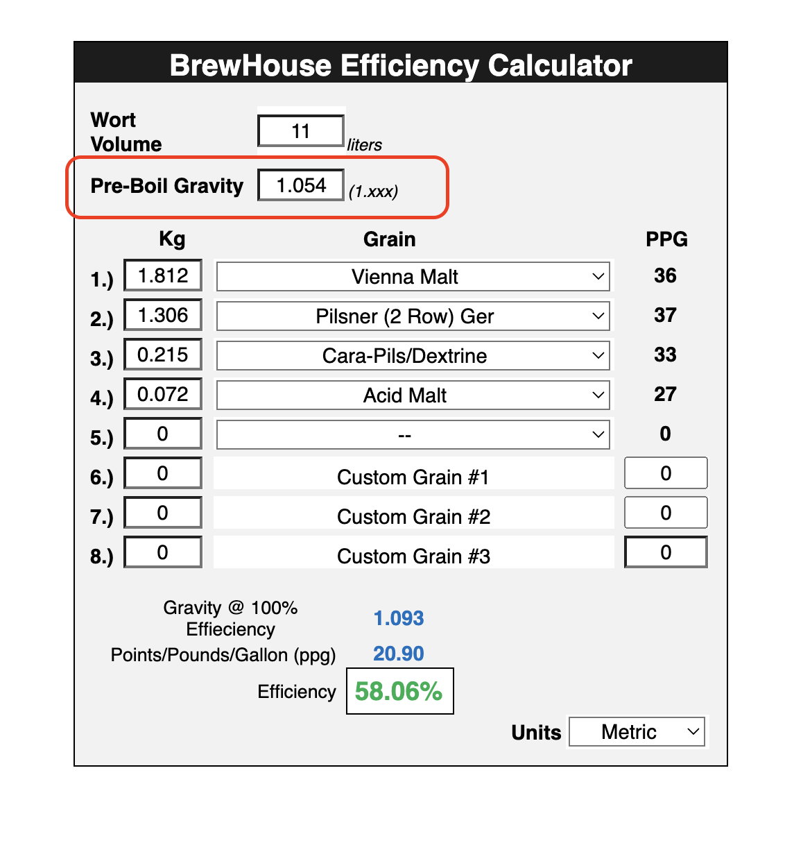 Ich habe meine Brewhouse Efficiency aus meinem letzten Sud berechnet und komme nun auf 70%.